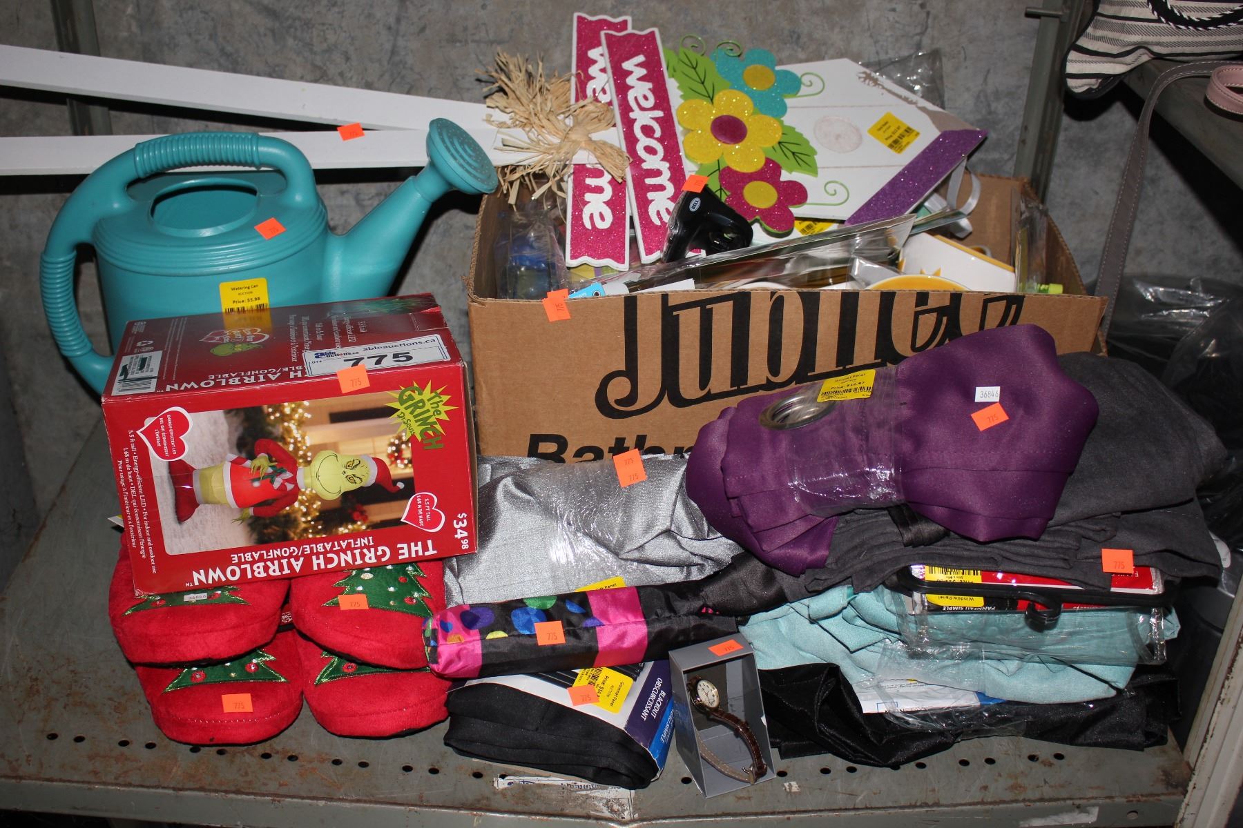 SHELF OF HOME ITEMS INCLUDING CHRISTMAS DECOR, CURTAINS, PLANT POTS, AND MORE