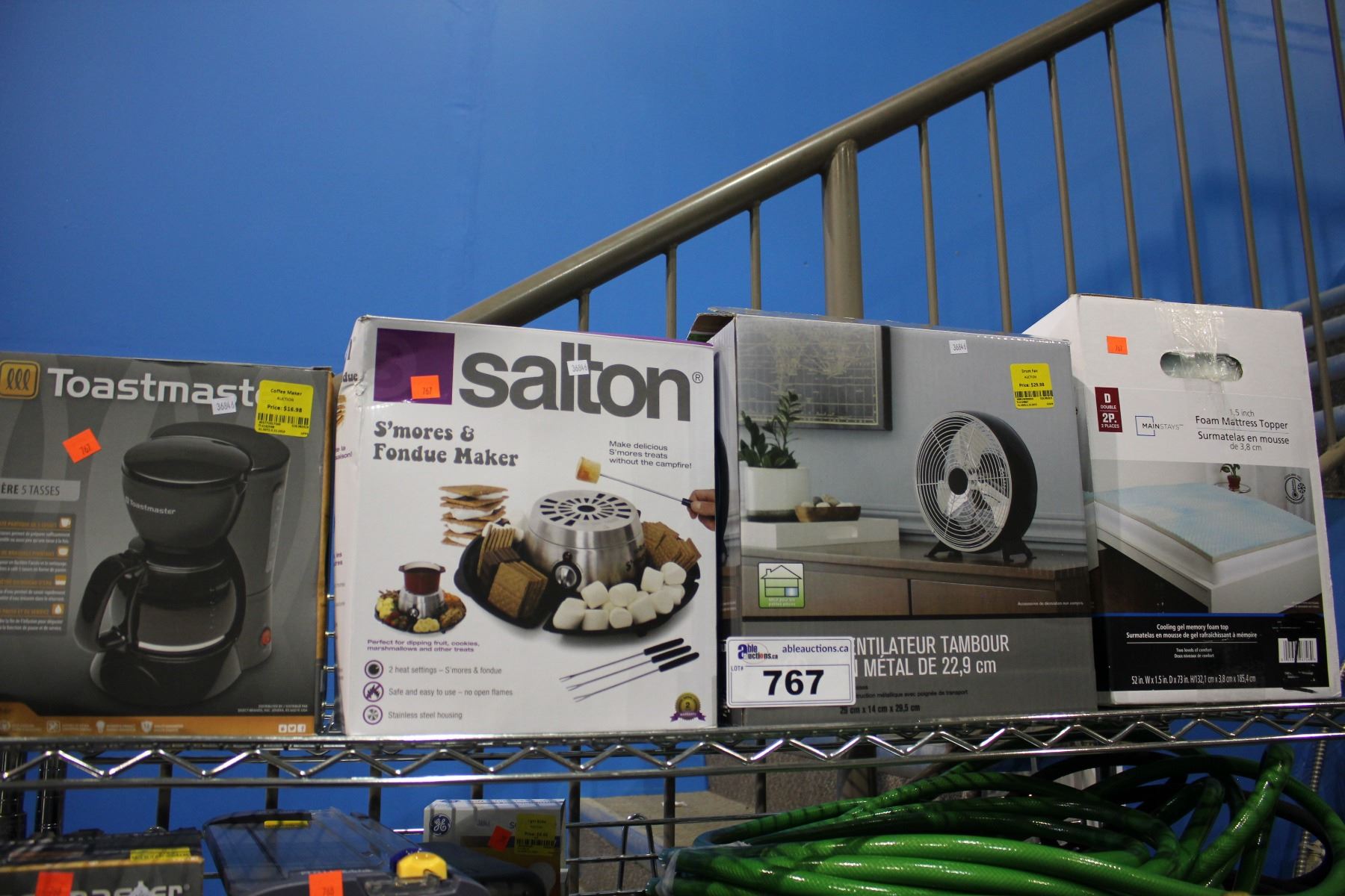 SHELF OF HOME ITEMS INCLUDING COFFEE MAKER, FONDUE MAKER, FAN, AND MATTRESS TOPPER