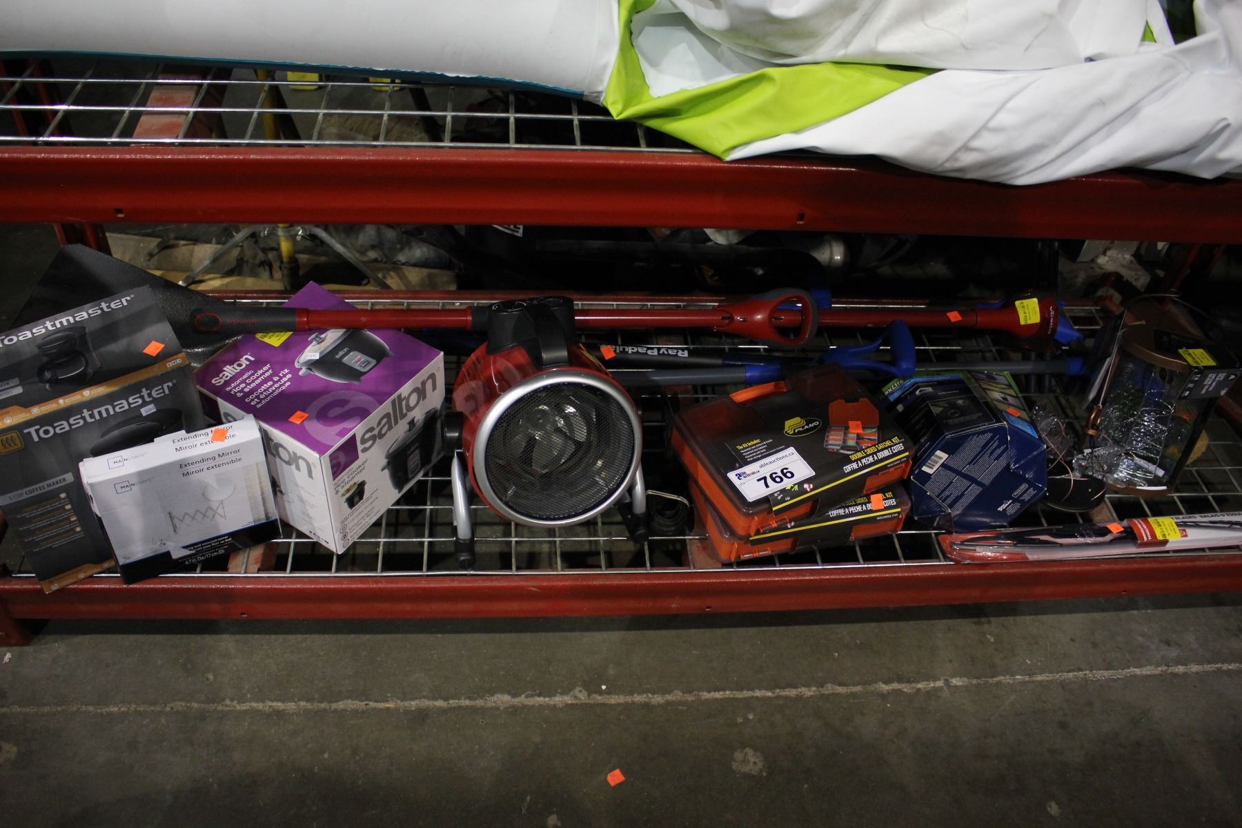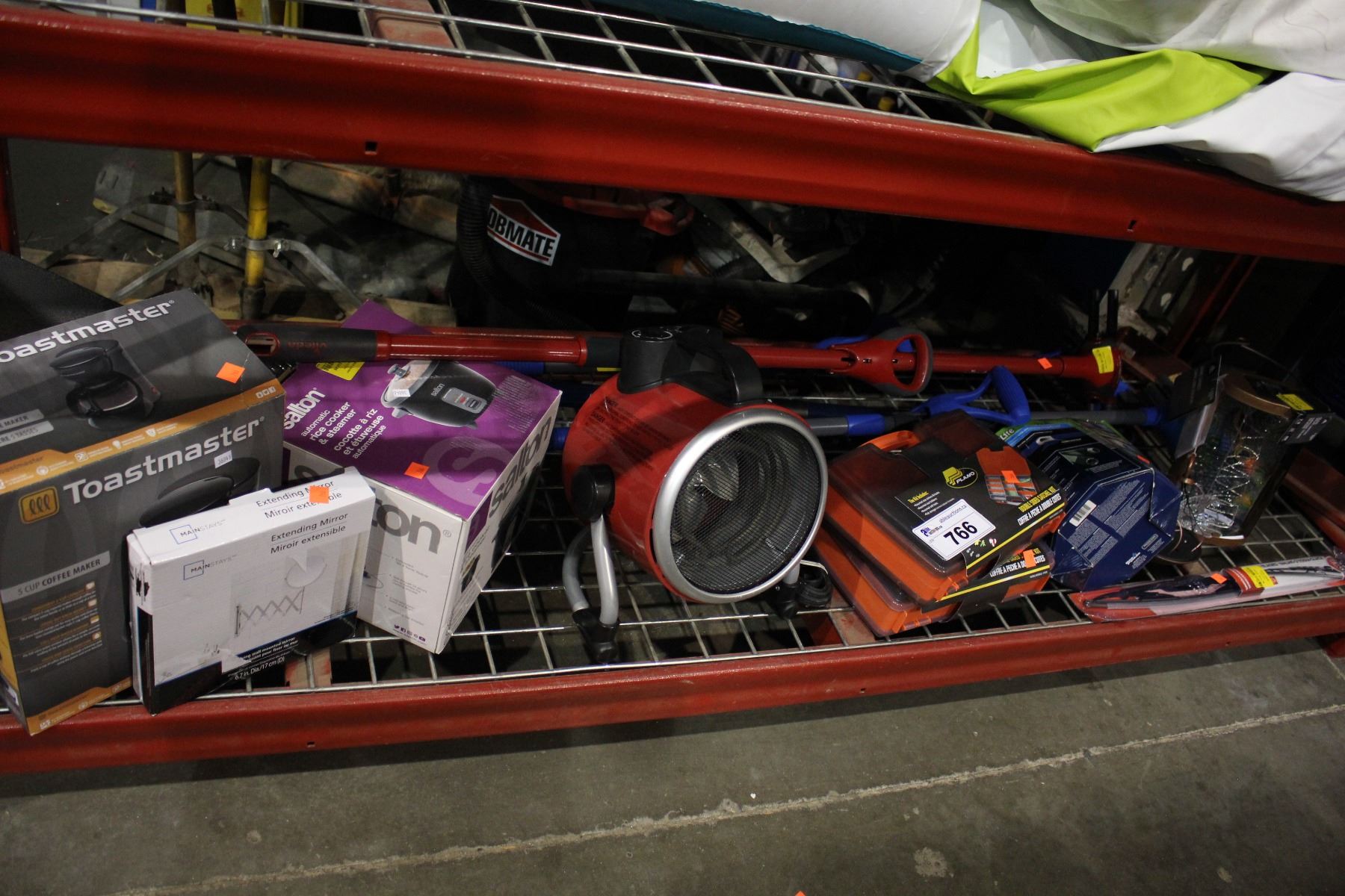 SHELF OF HOME ITEMS INCLUDING COFFEE MAKER, PLANO SATCHEL KITTS, MOPS, AND MORE