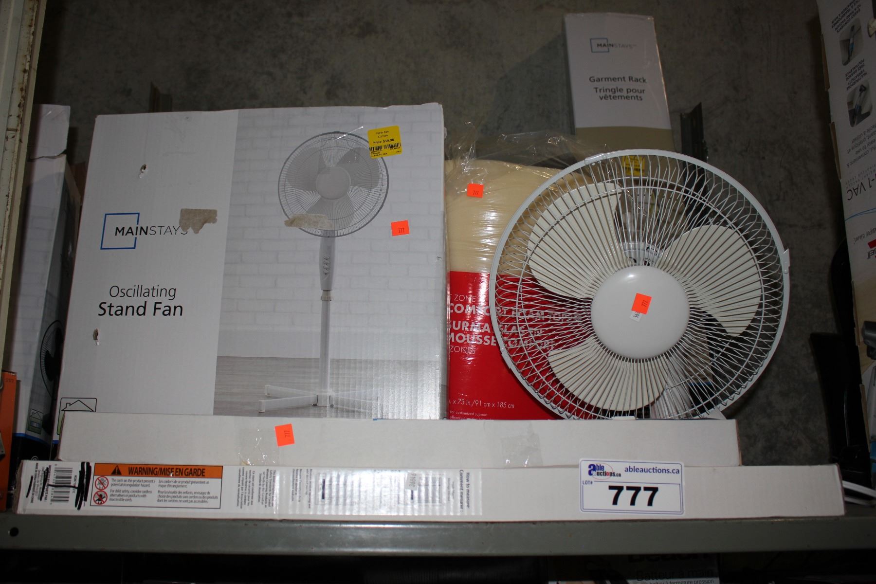 SHELF OF HOME ITEMS INCLUDING FAN, BLINDS, FOAM, AND MORE