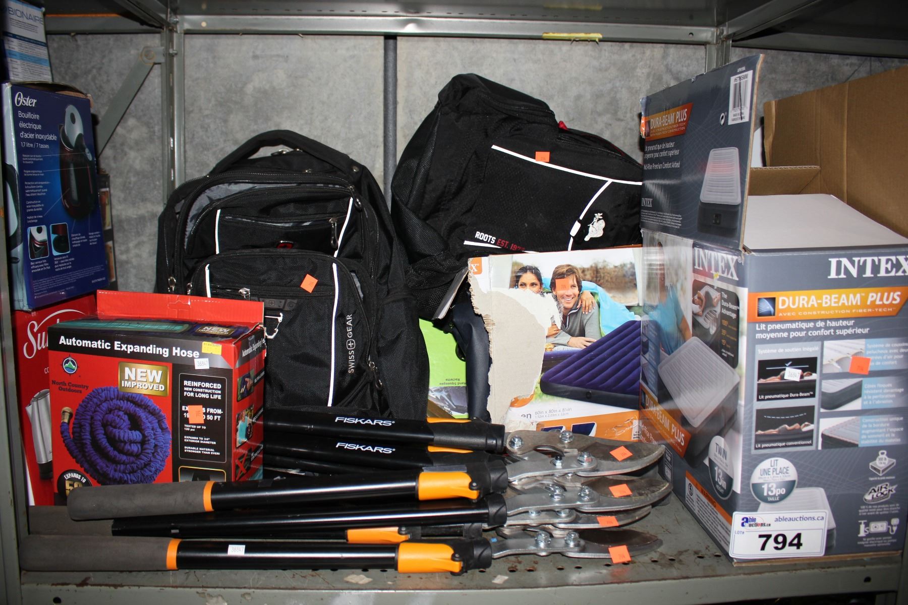 SHELF OF HOME ITEMS INCLUDING FISKARS SHEARS, SWISS GEAR BACKPACK, ROOTS BAD, AIRBEDS, AND MORE