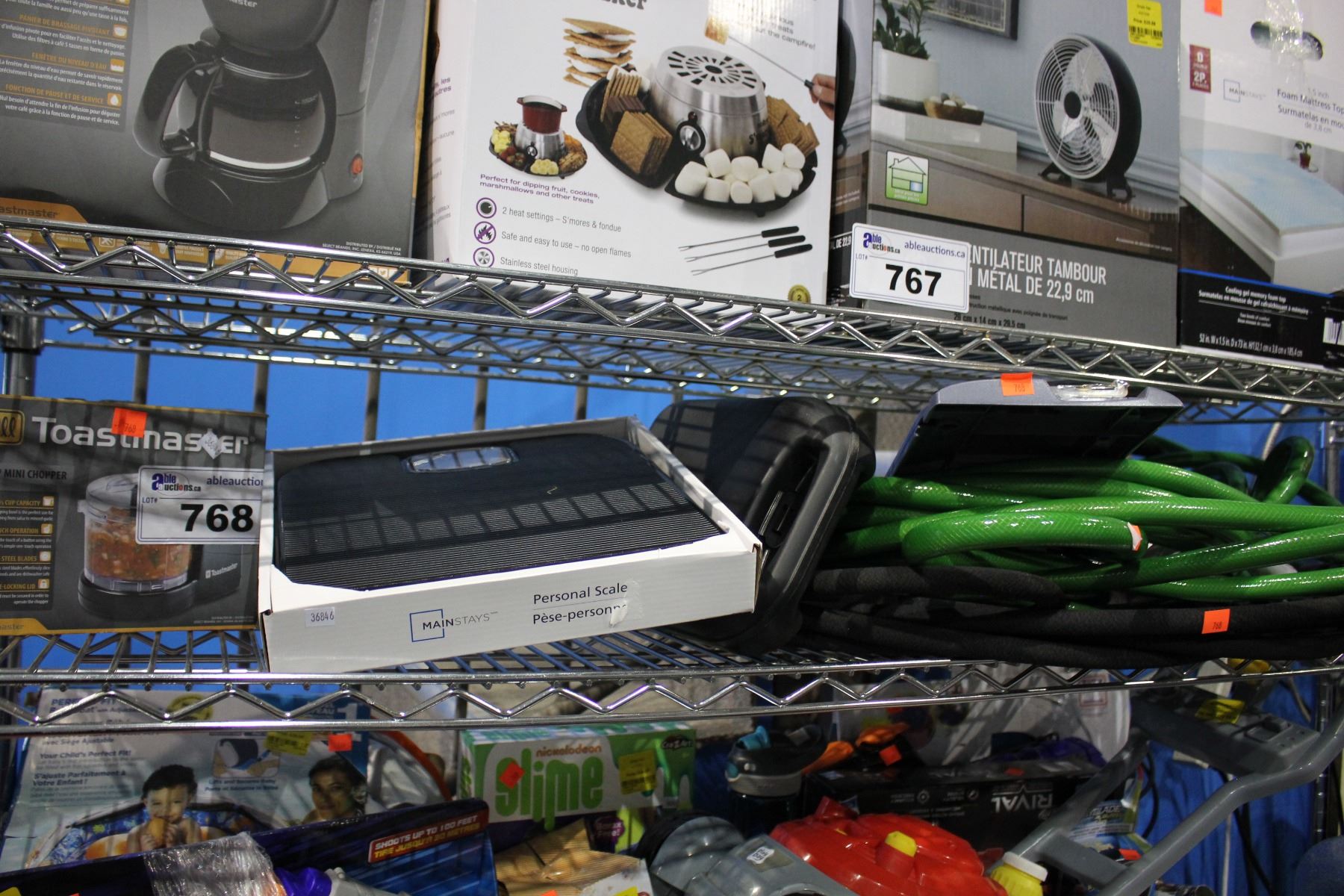 SHELF OF HOME ITEMS INCLUDING SCALE, CHOPPER, WAHL TRIMMER, HOSE, AND MORE