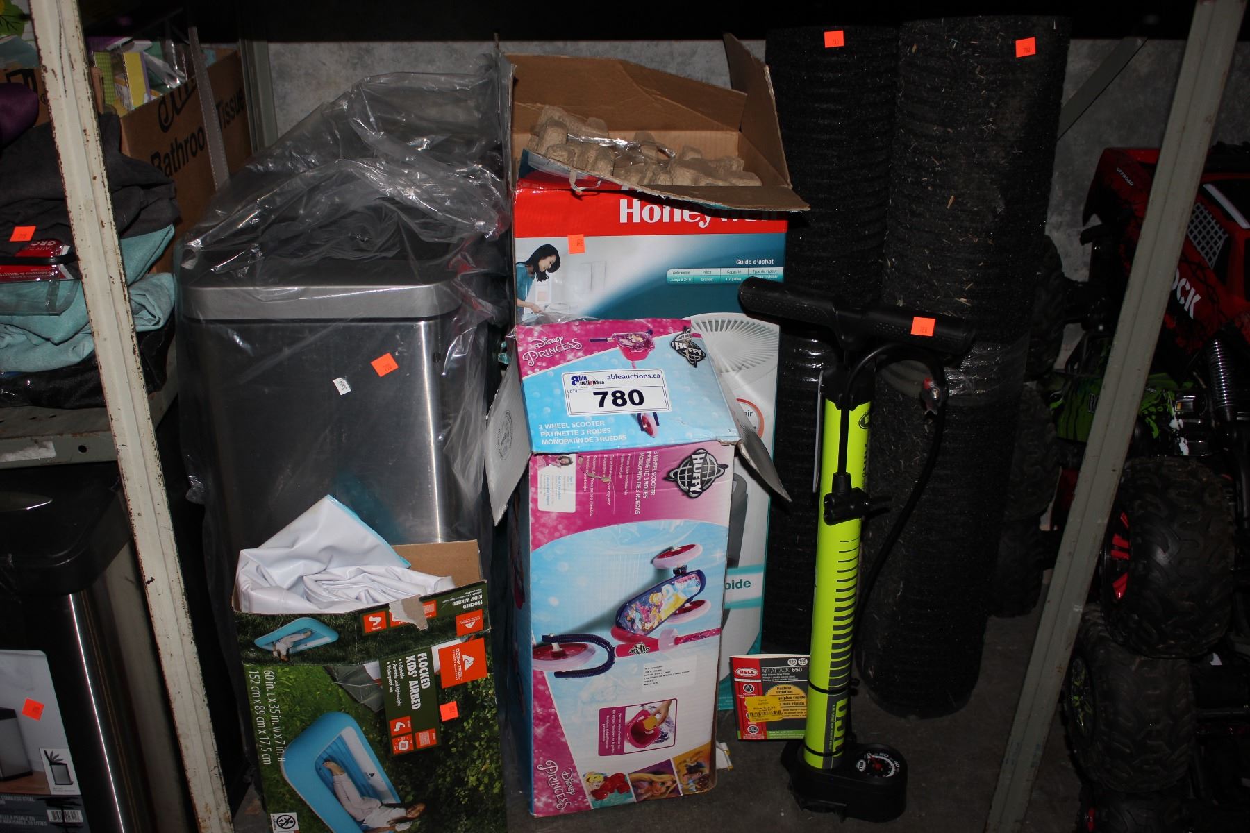SHELF OF HOME ITEMS INCLUDING TRASH BIN, AIR PUMP, AIRBED, AND MORE