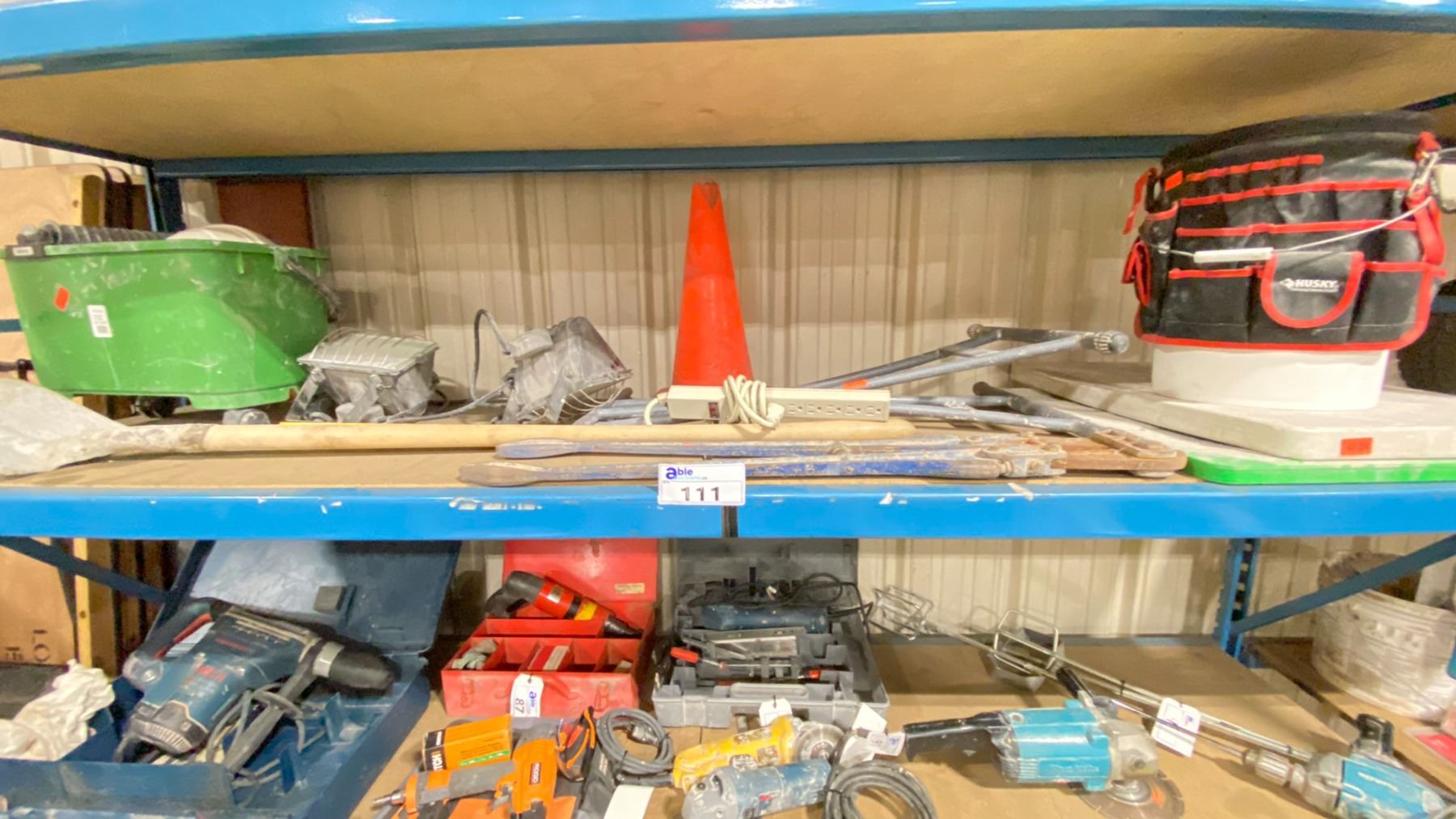SHELF OF HUSKY BUCKET BAG, HEAVY DUTY BOLT CUTTERS, WORK LIGHTS, SHOVEL & MORE