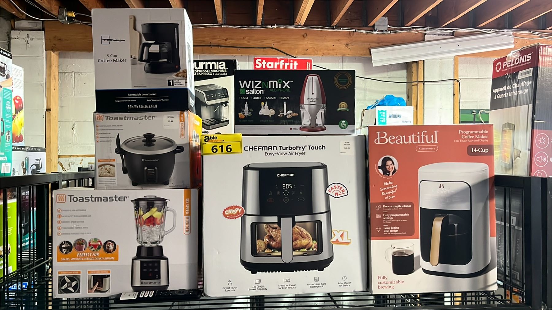SHELF OF KITCHEN ITEMS: COFFEE MAKER, RICE COOKER, BLENDER, AIR FRYERS & WIZ N MIX