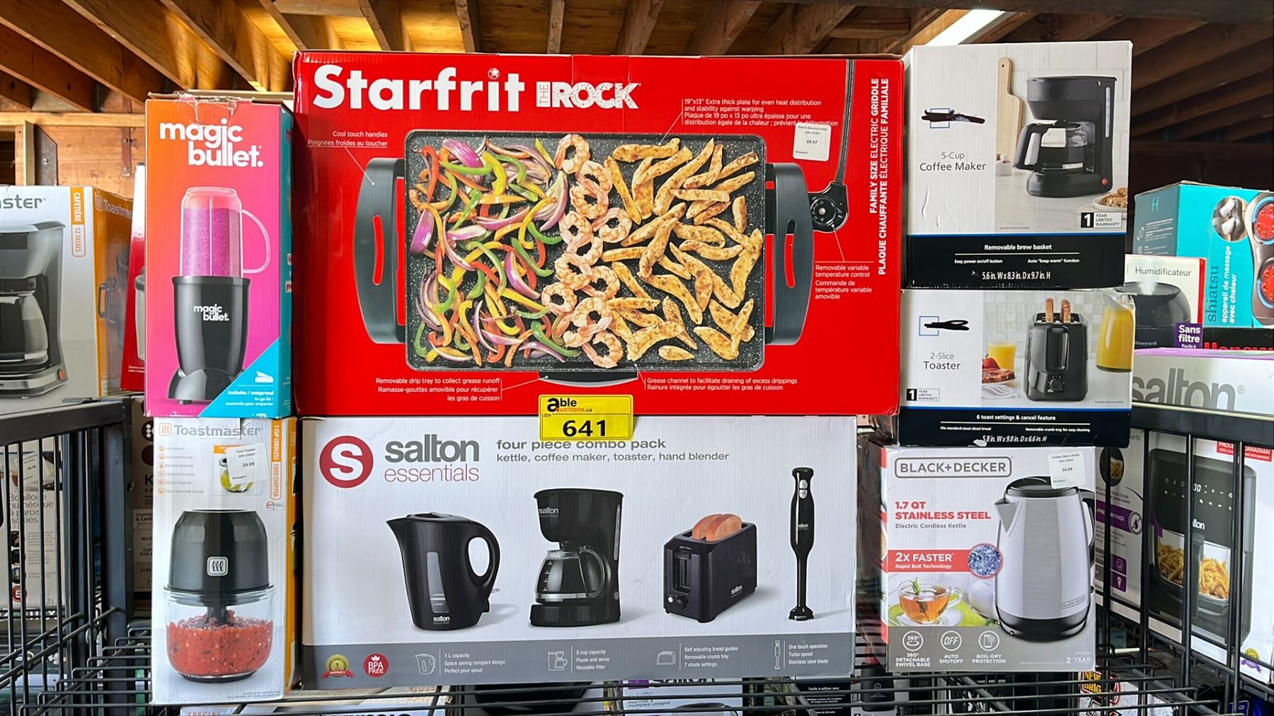 SHELF OF KITCHEN ITEMS: MAGIC BULLET BLENDER, SALTON 4 PIECE COMBO PACK, ROCK GRIDDLE & MORE