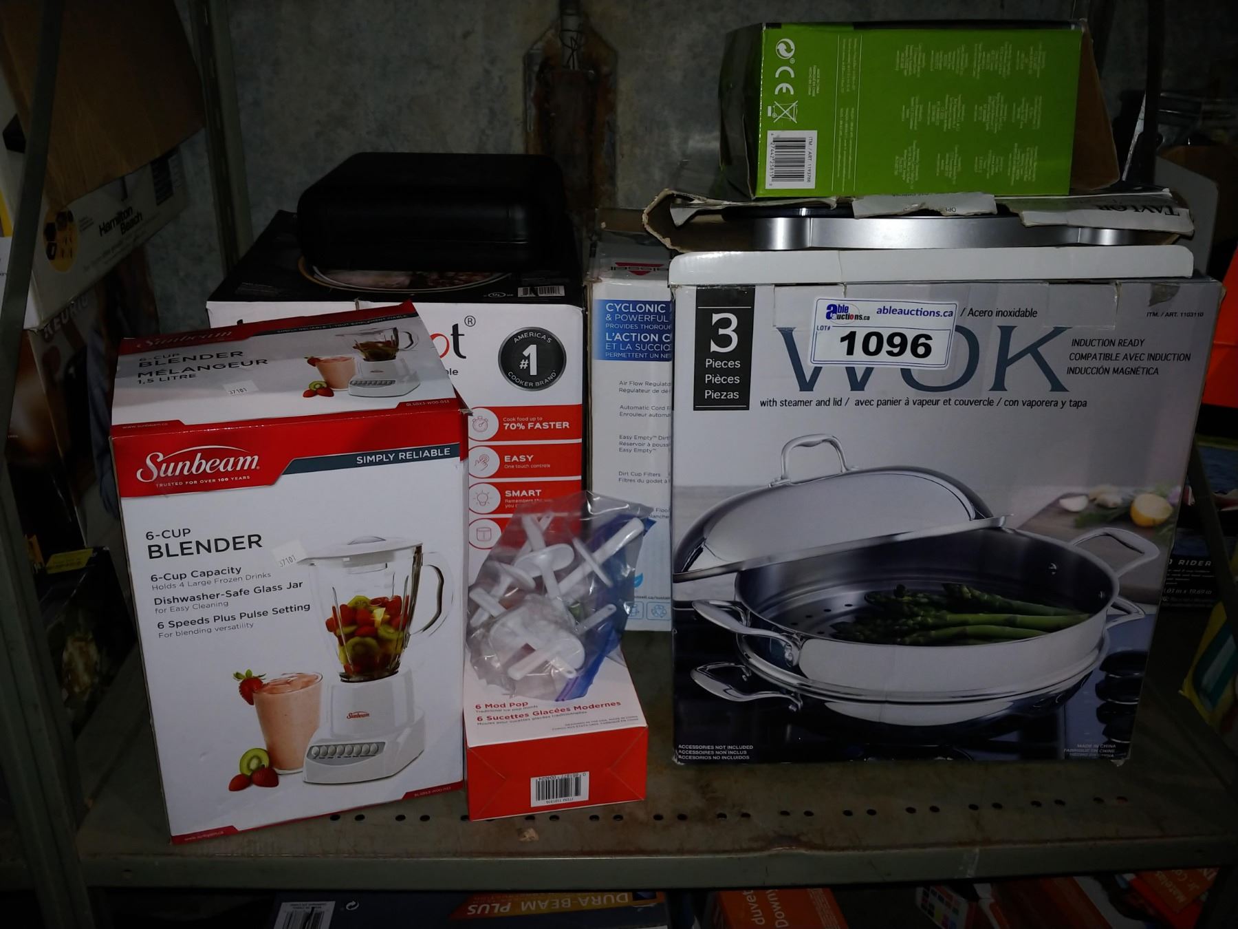 SHELF OF KITCHEN ITEMS, VACUUM AND MORE