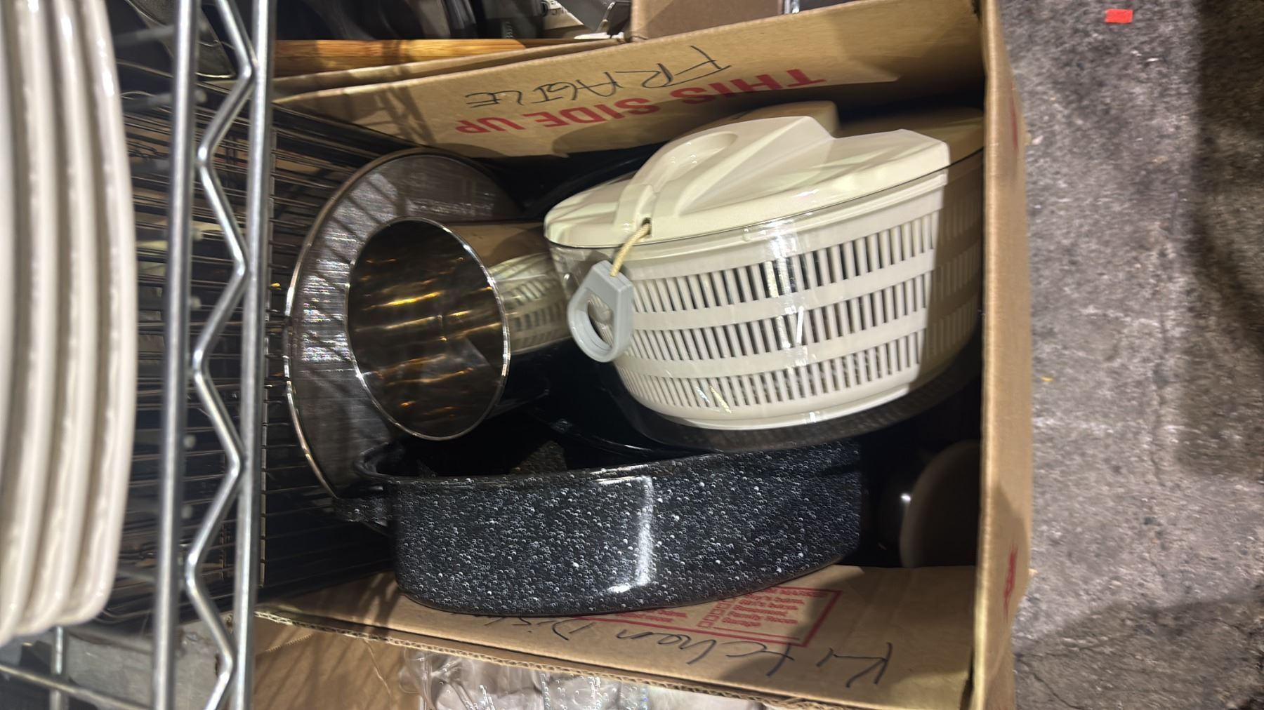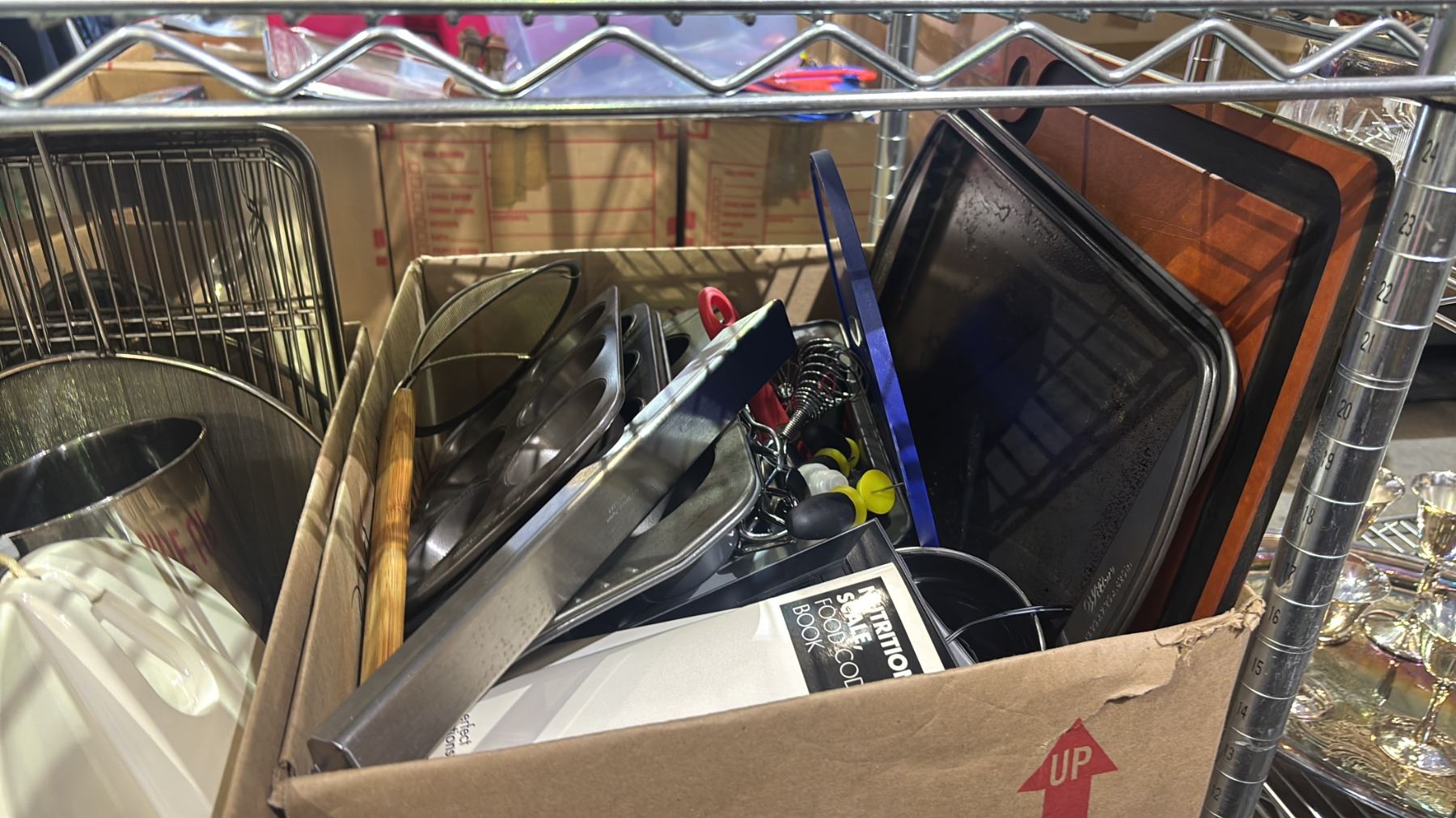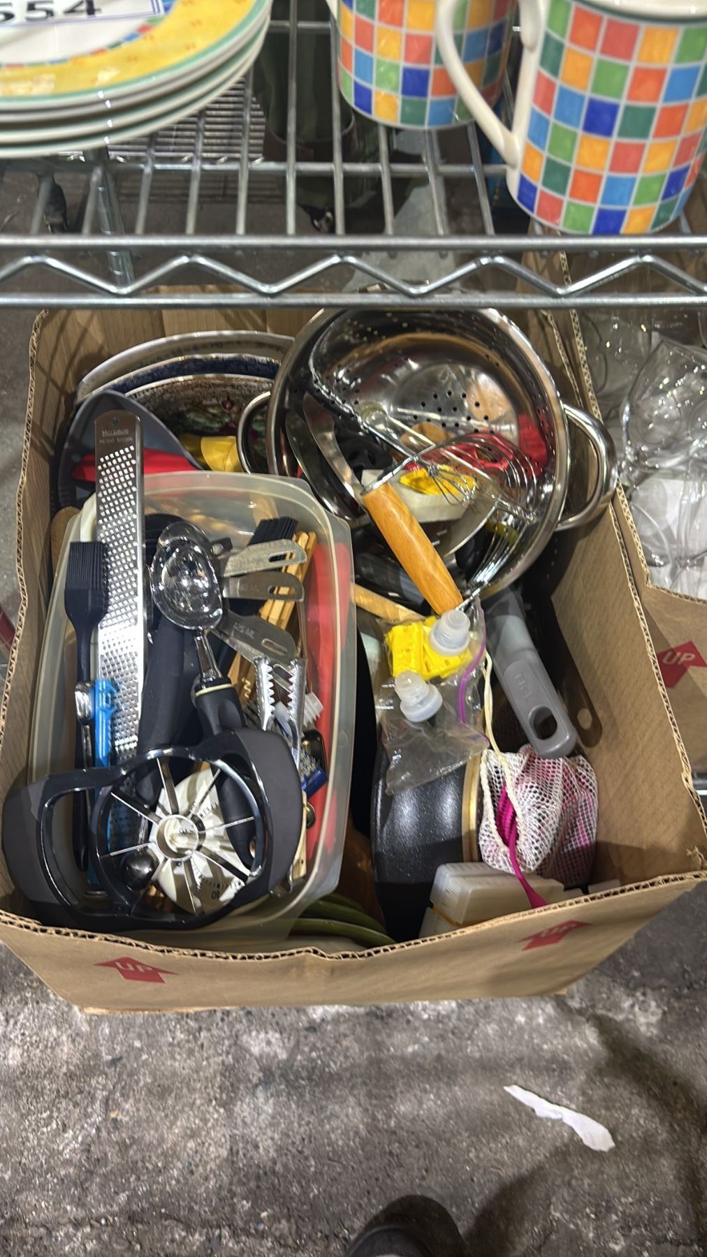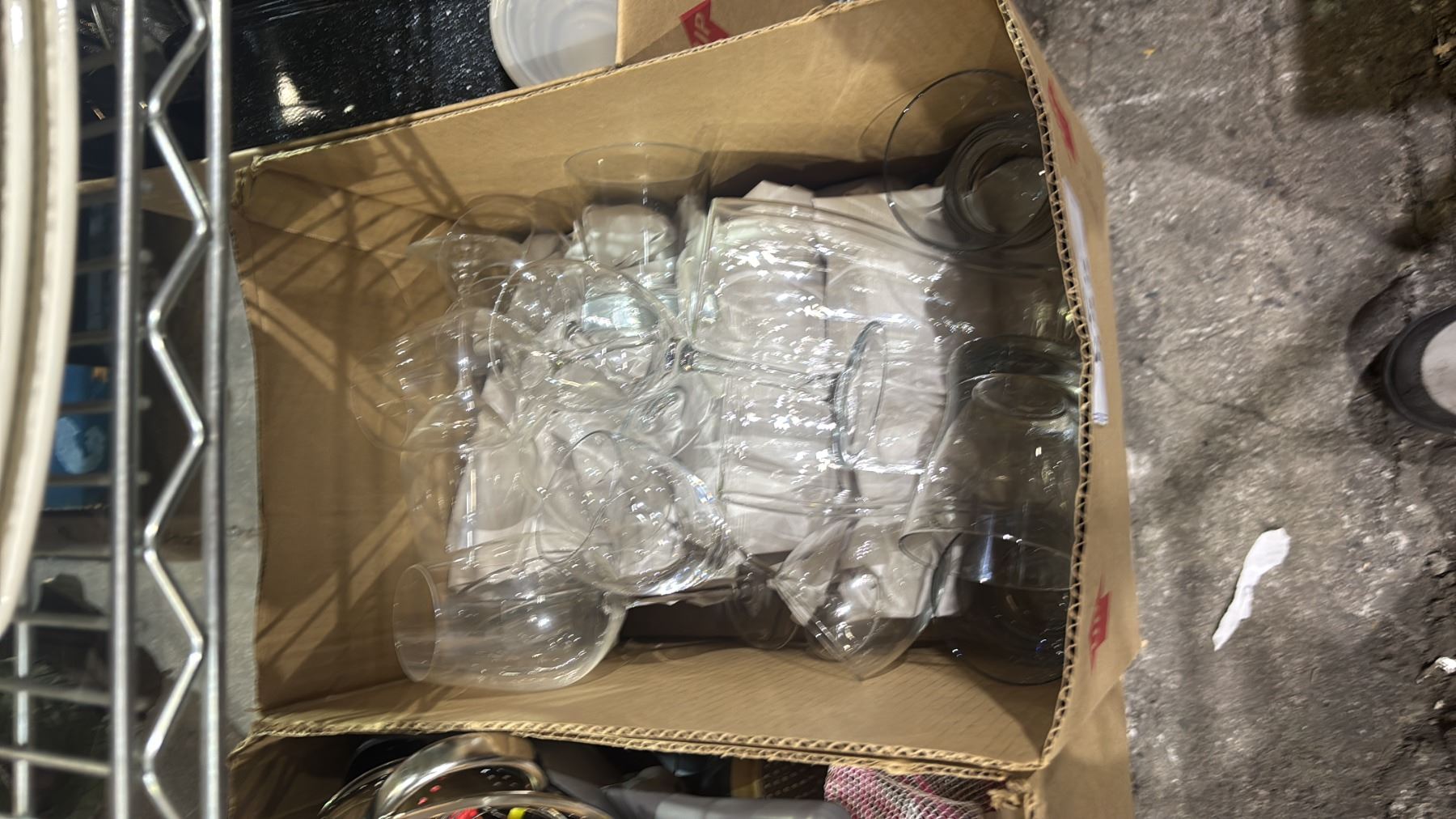 SHELF OF KITCHENWARE - WINE GLASSES, UTENSILS, PANS & MORE