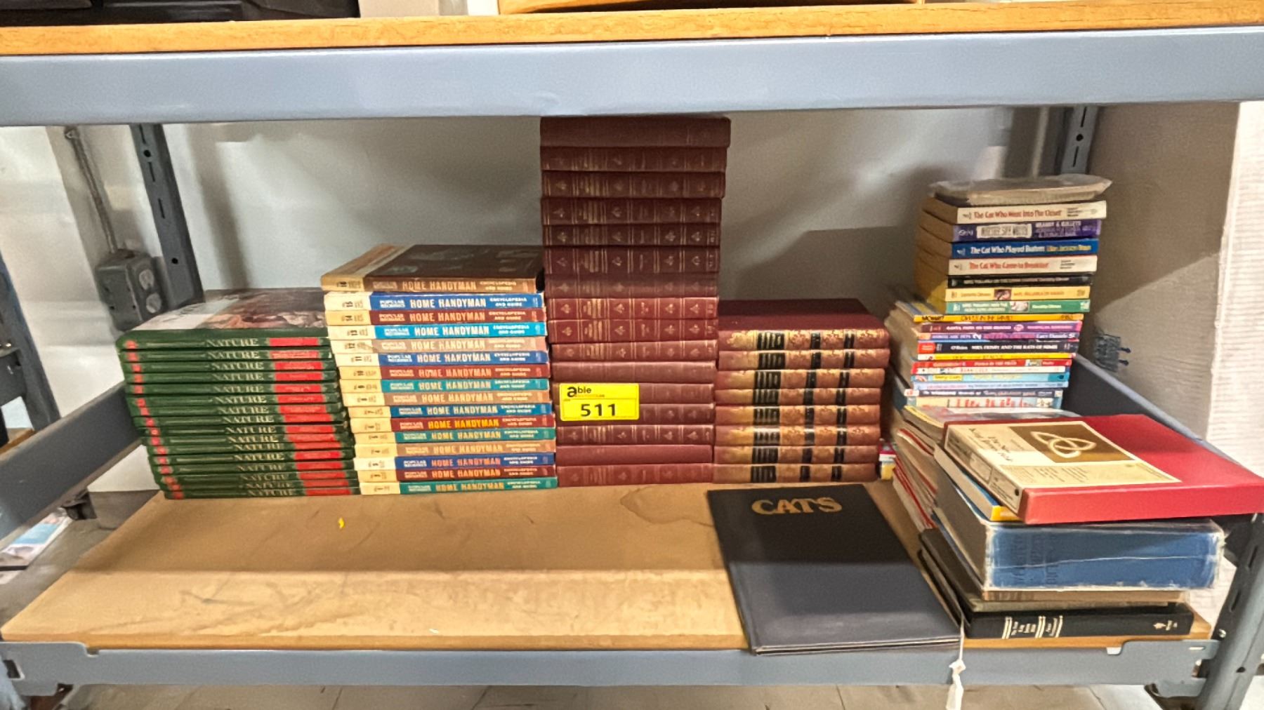 SHELF OF LARGE ASSORTMENT OF ENCYCLOPEDIAS, KIDS BOOKS, BIBLES AND MORE