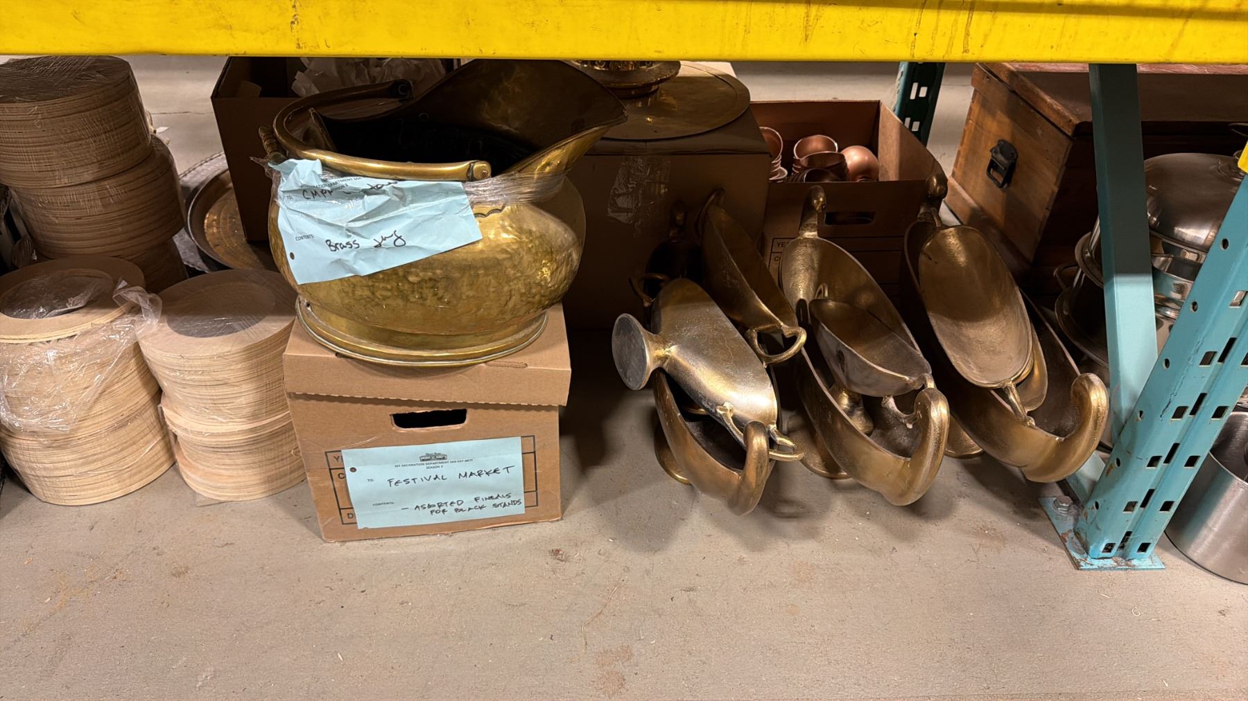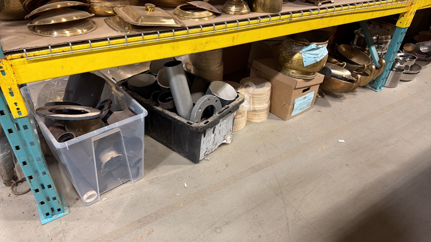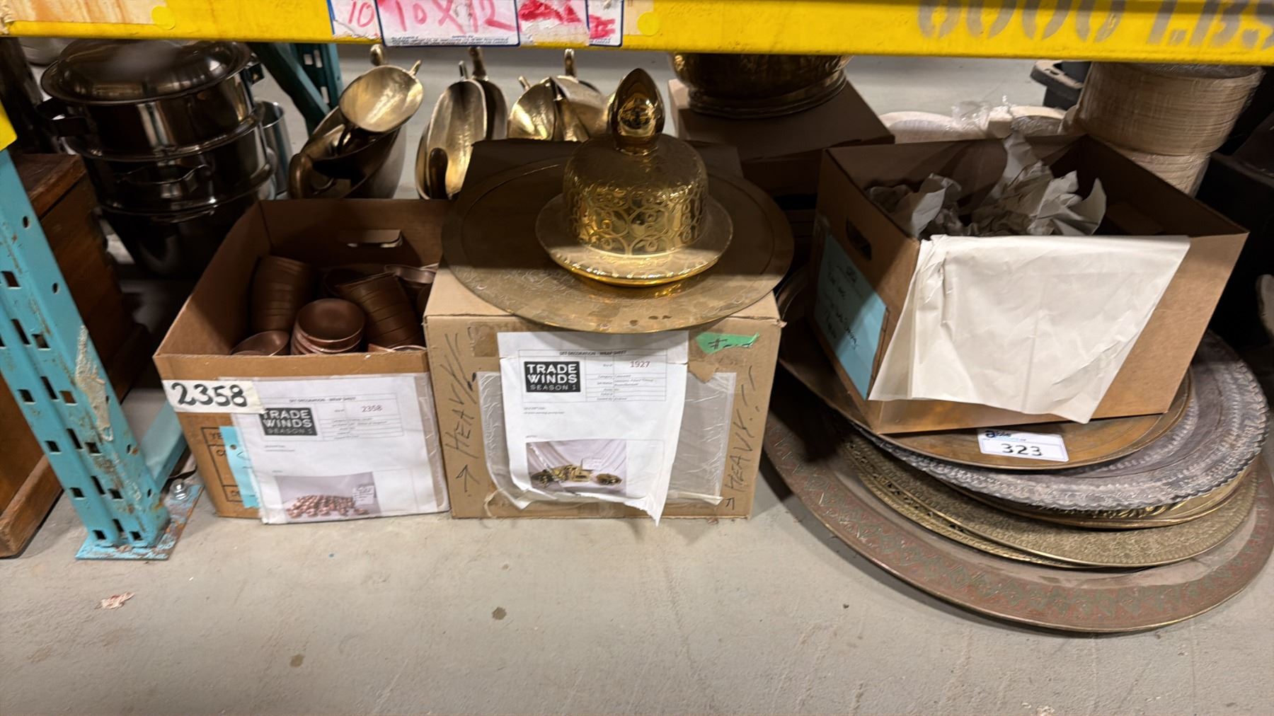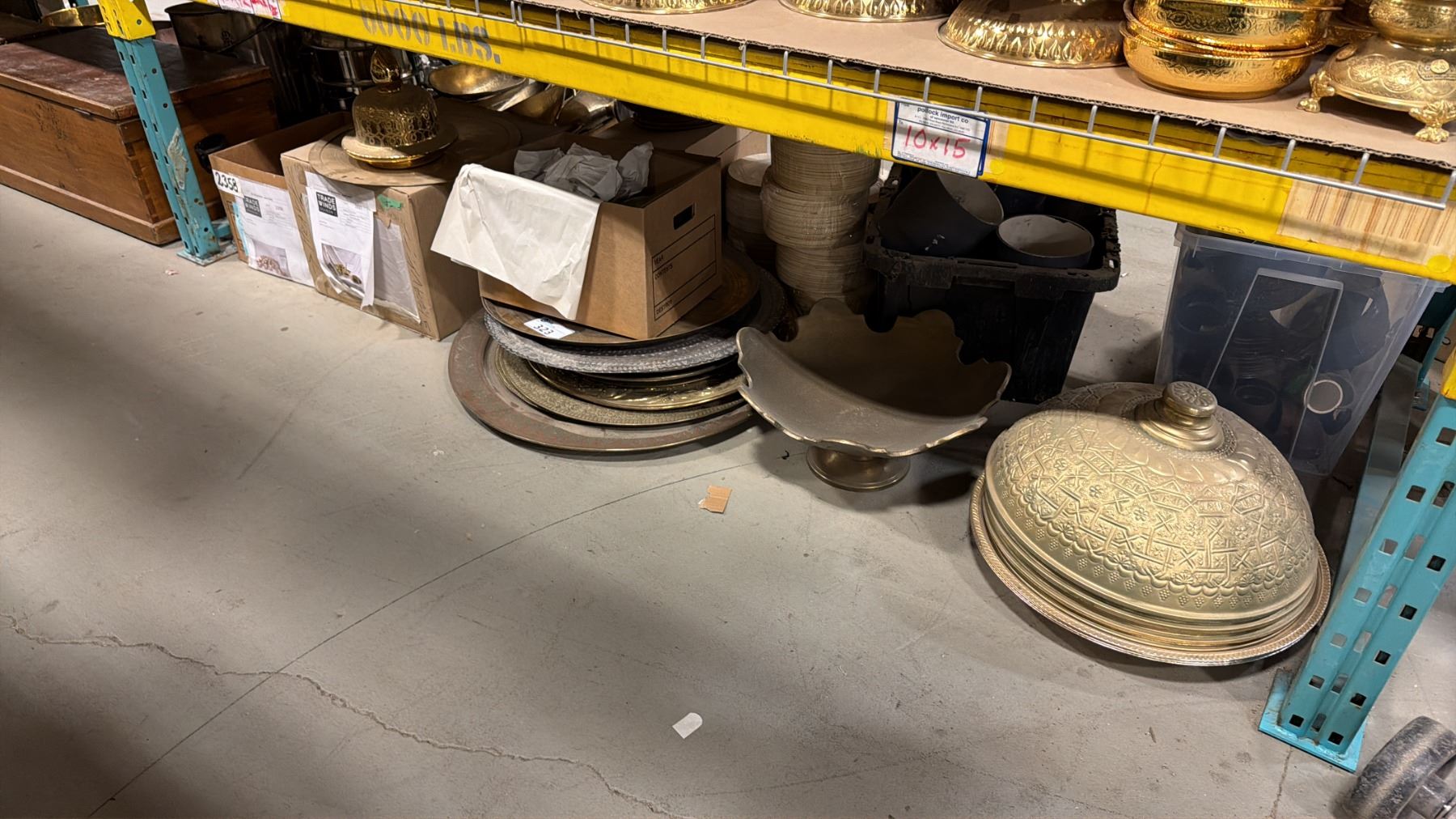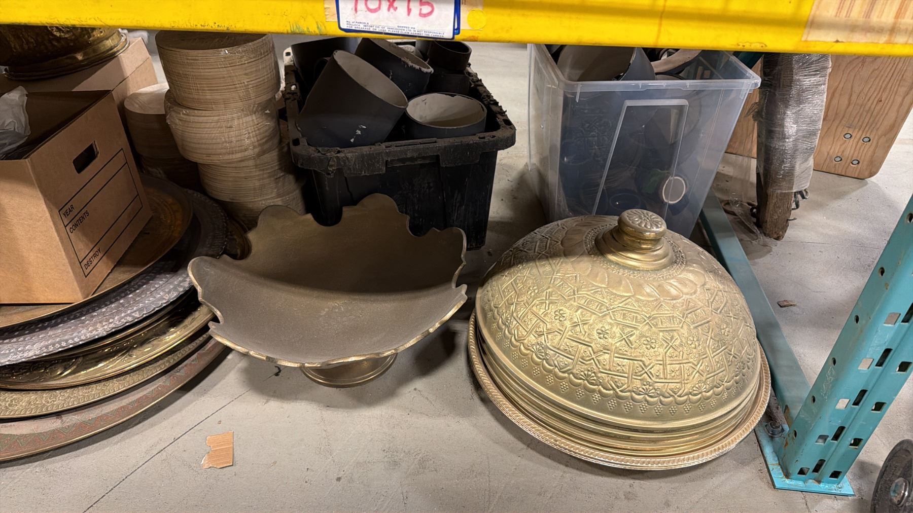 SHELF OF LARGE BRASS SERVING PLATES, CLOCHES, SMALL DECORATIVE BOWLS, LARGE BRASS JUG & ASSORTED SET DEC ITEMS