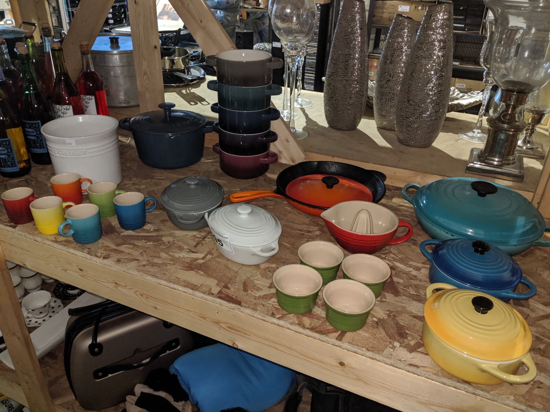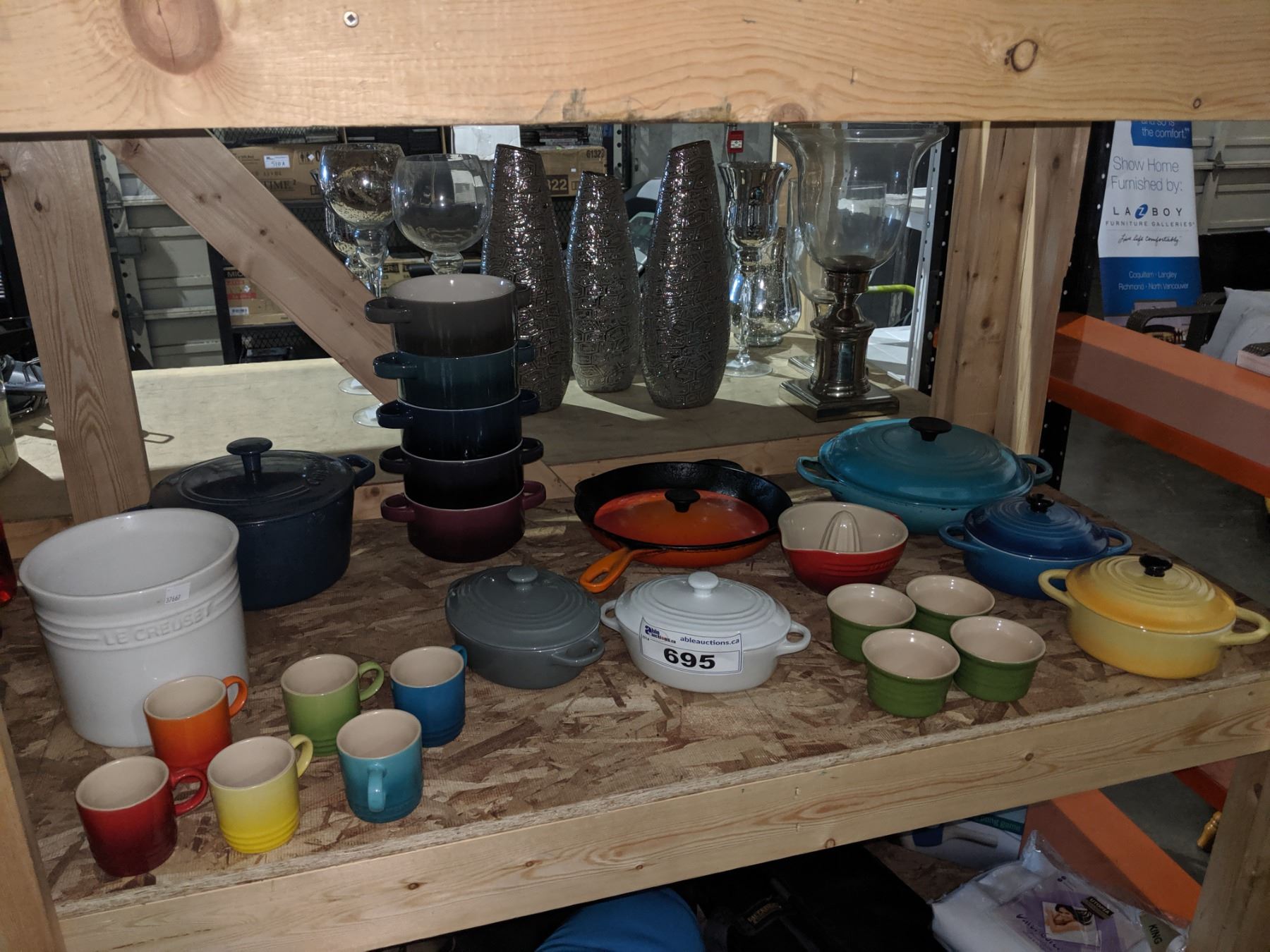 SHELF OF LE CREUSET DISHWARE AND MORE
