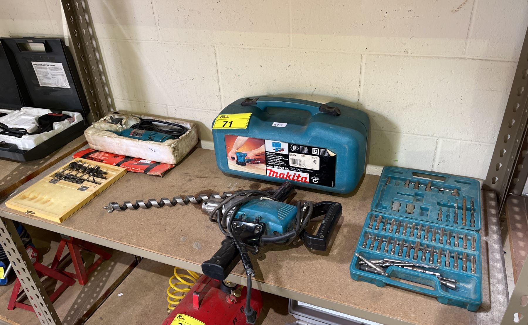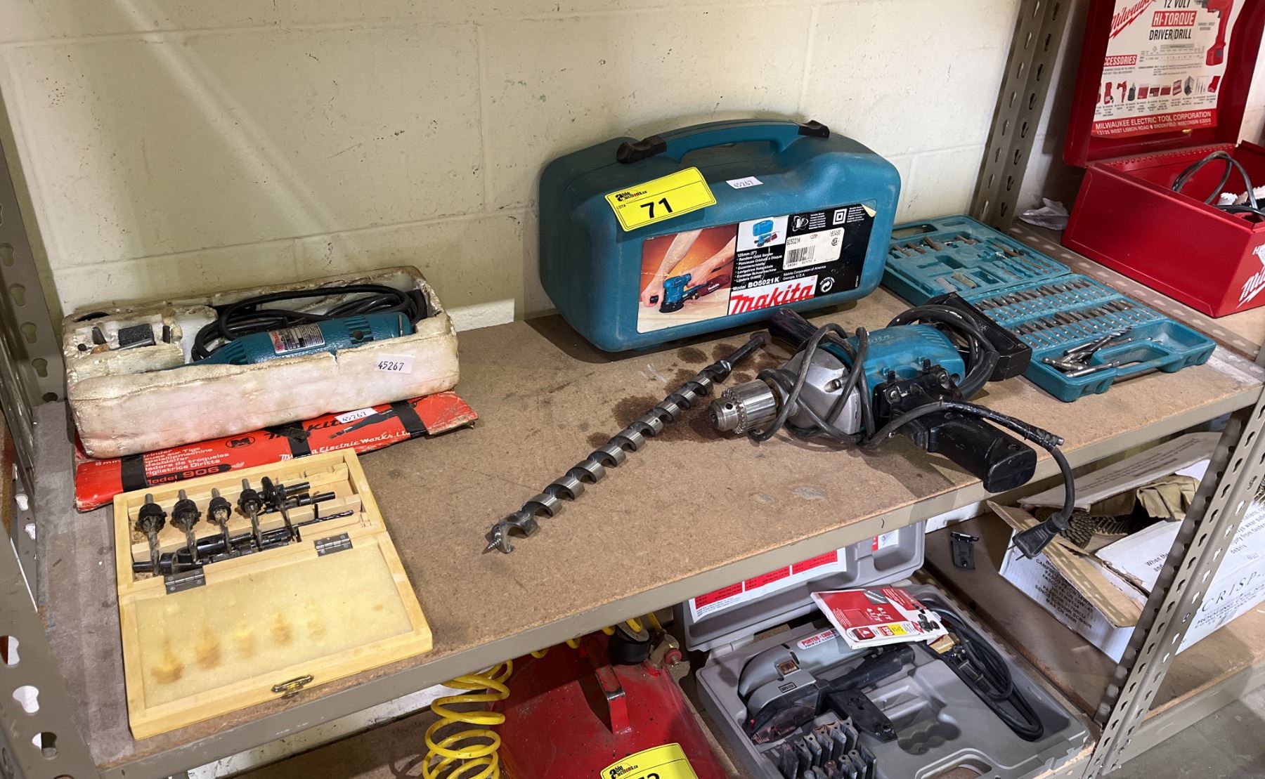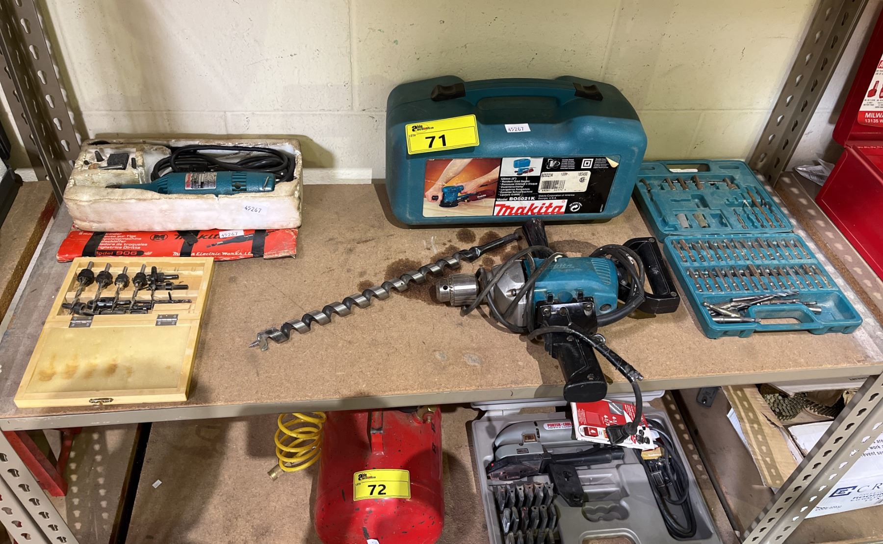 SHELF OF MAKITA DRILL, DIE GRINDER, RANDOM ORBIT SANDER AND MORE