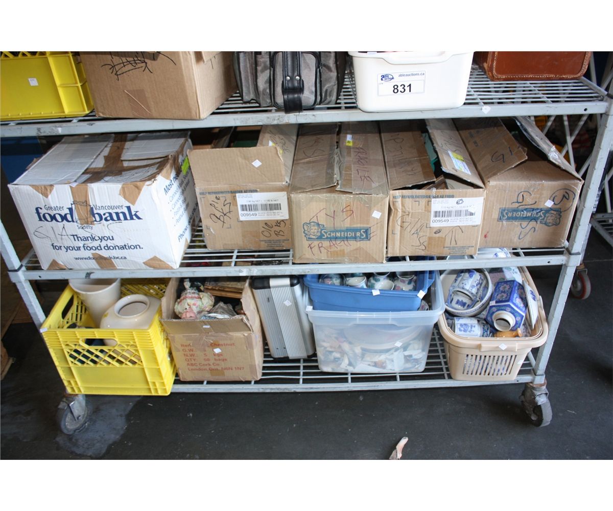 SHELF OF MISC COLLECTOR AND HOUSEHOLD ITEMS (ROLLING SHELF NOT INCLUDED)