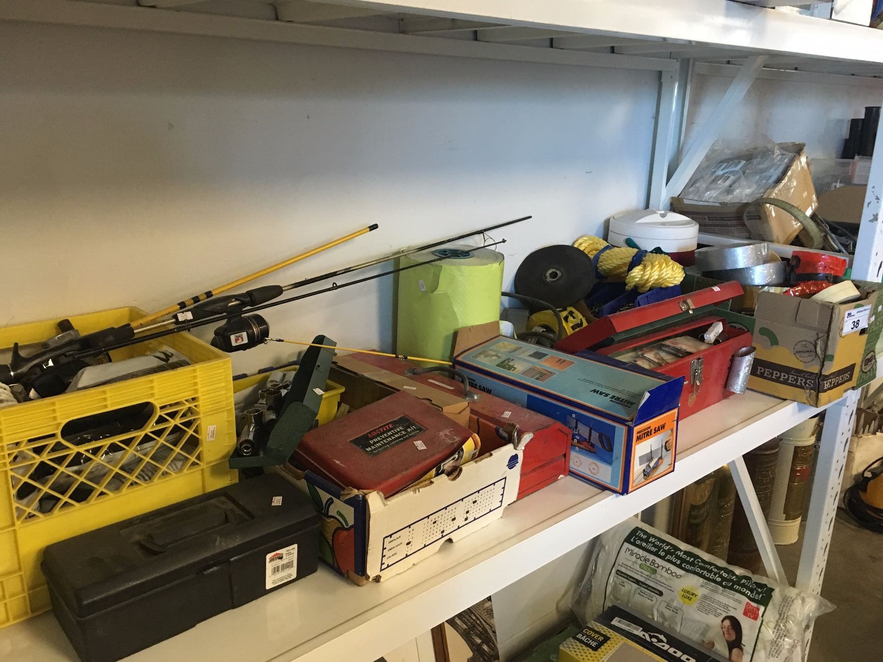 SHELF OF MISC FISHING GEAR/SAFTEY BELTS/ROPE/MISC TOOLS