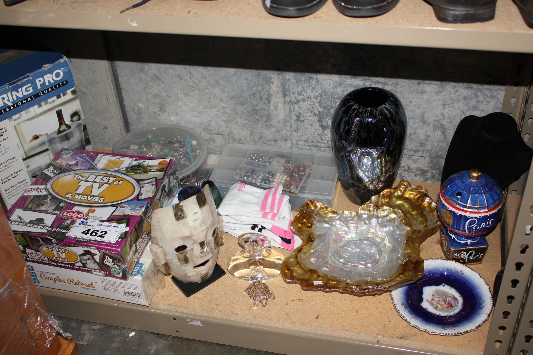 SHELF OF MISC. INCLUDING BOARD GAMES, WINE CHILLER, PERFUME, BEADS, VASES, PLATES, AND MORE