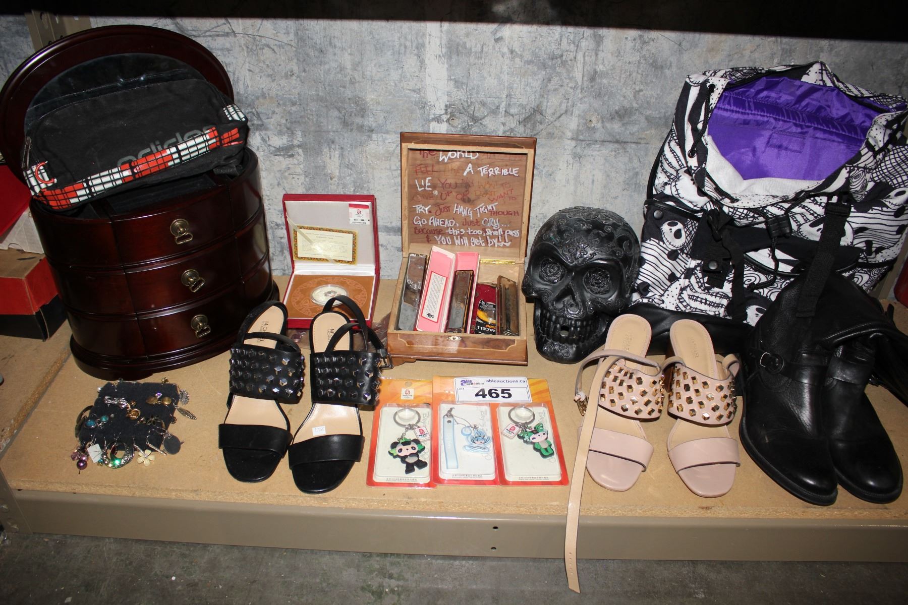 SHELF OF MISC. INCLUDING HIGH HEELS, BOOTS, BAGS, HARMONICAS, JEWELLERY, AND MORE