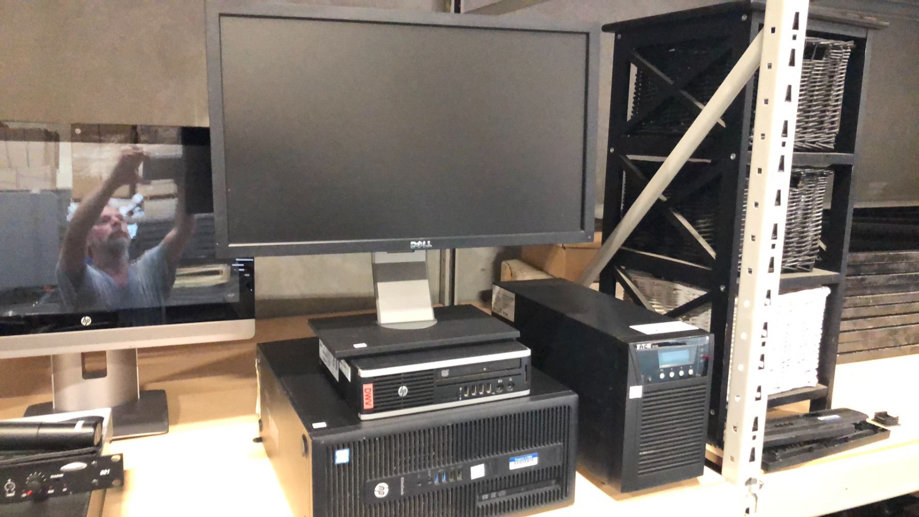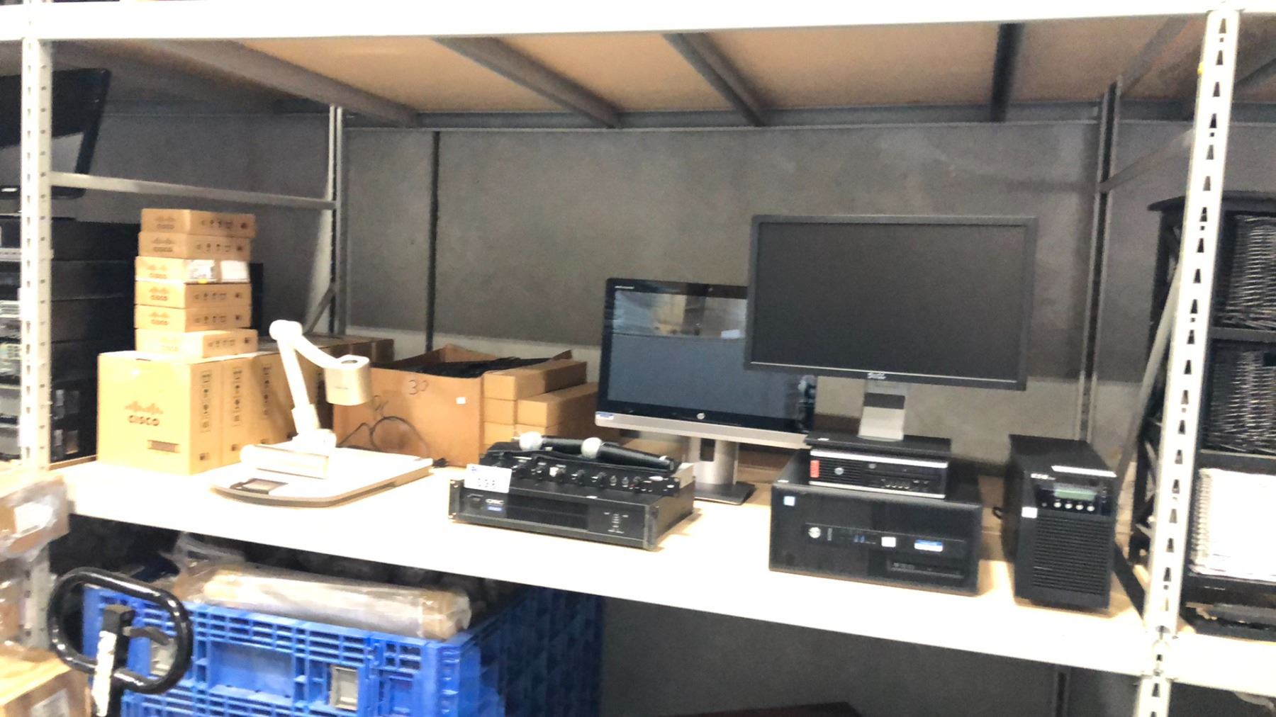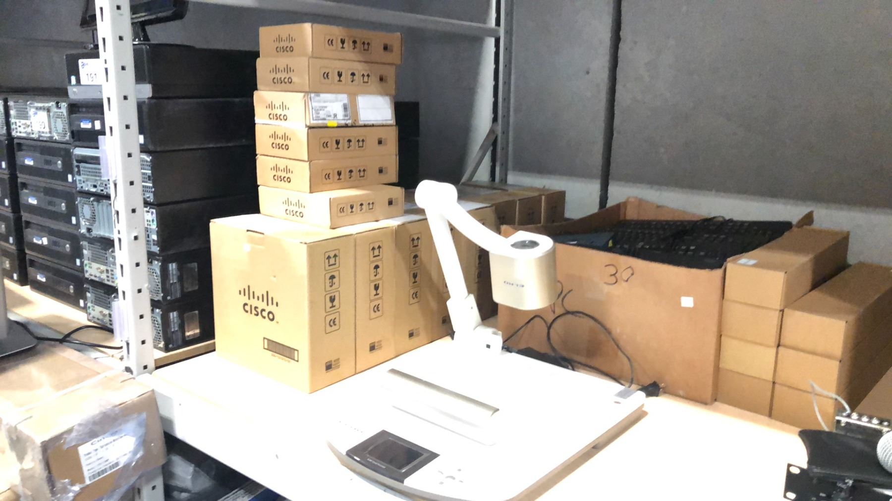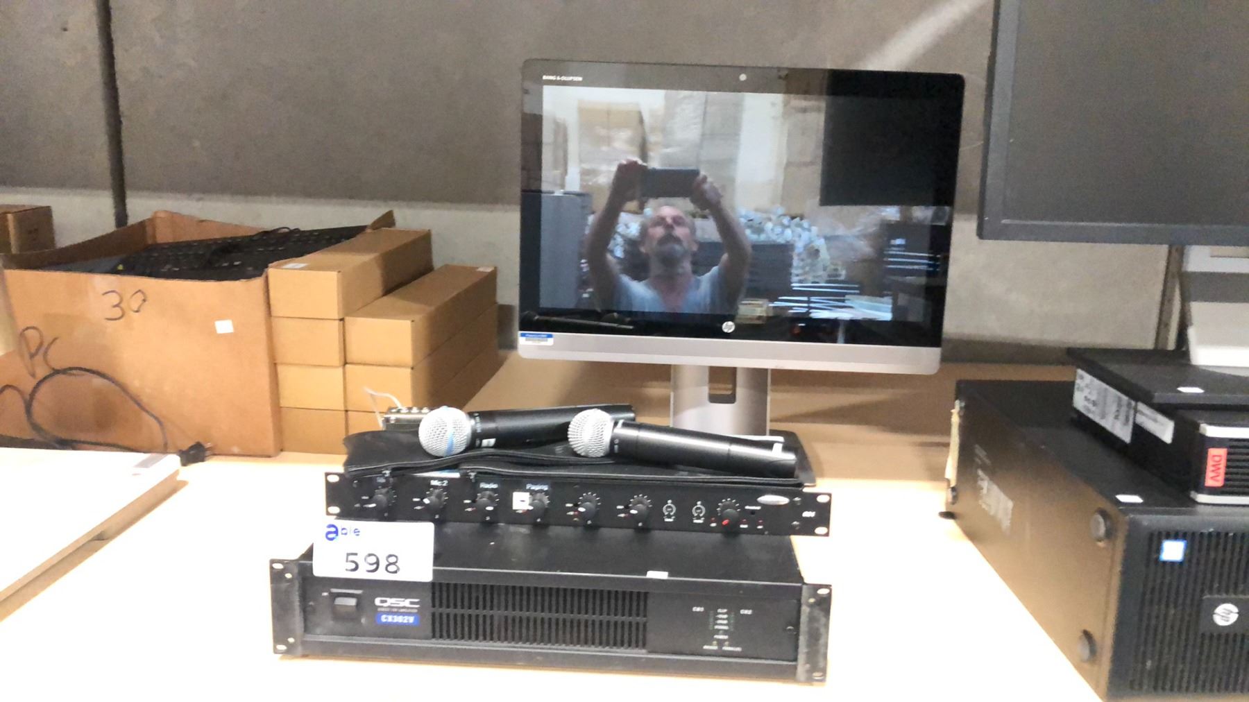 SHELF OF MISC ITEMS INCL QSC CX302V PROFESSIONAL-GRADE DIRECT 70V POWER AMPLIFIER, BIAMP 601 PROFESSIONAL AUDIO DEVICE SIX-INPUT MIC/LINE MIXER, 2 SHURE MICROPHONES, 2 DESKTOP COMPUTER EATON 9130 UPS, HP ELITEONE 800 G2 23-INCH PROFESSIONAL-GRADE, ALL-IN-ONE (AIO) TOUCH DESKTOP COMPUTER, ELMO P30HD DOCUMENT CAMERA, 8 CISCO IP PHONES, 5 CISCO 7915 EXPANSION MODULE AND MORE - MUST TAKE ALL