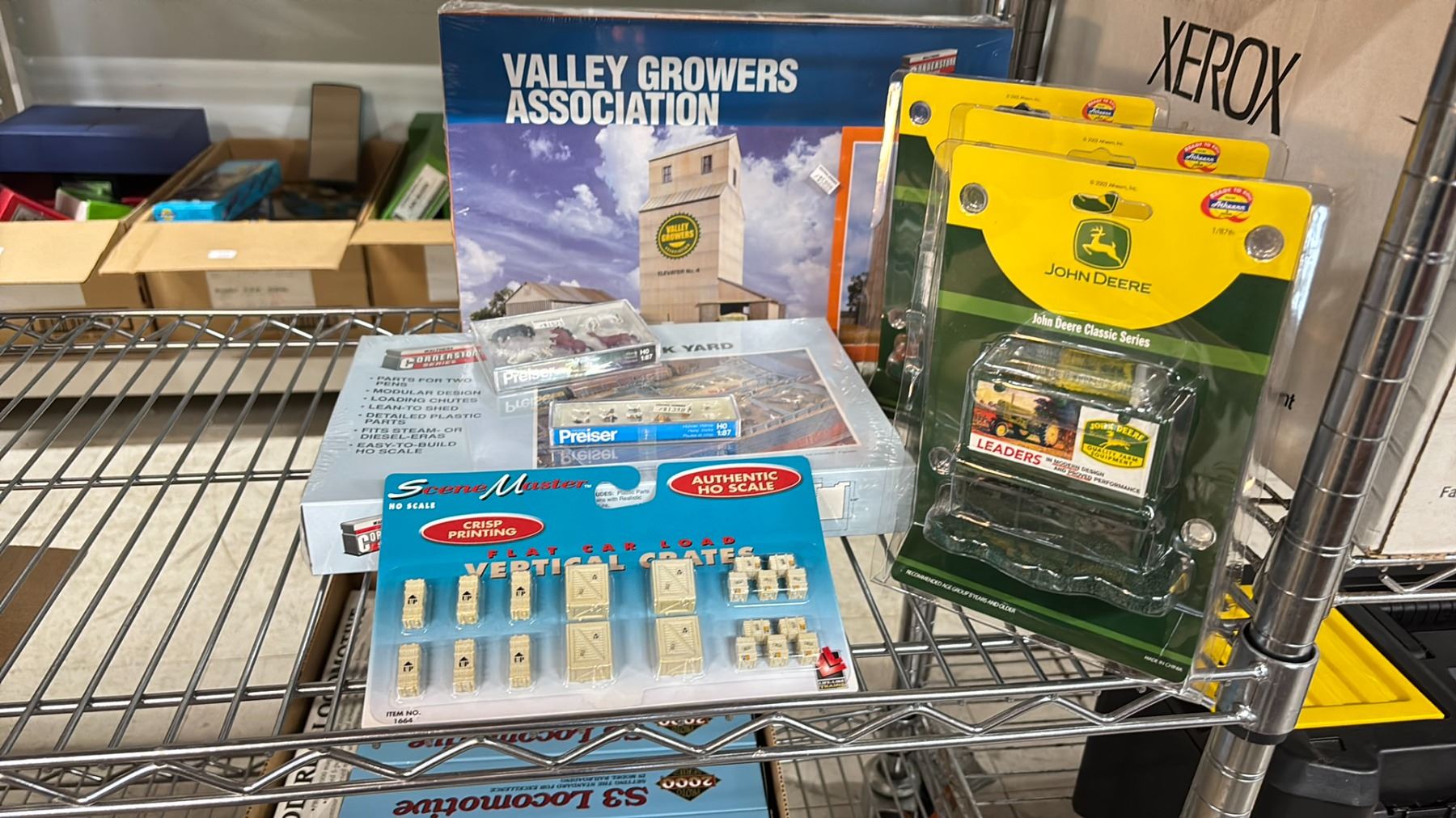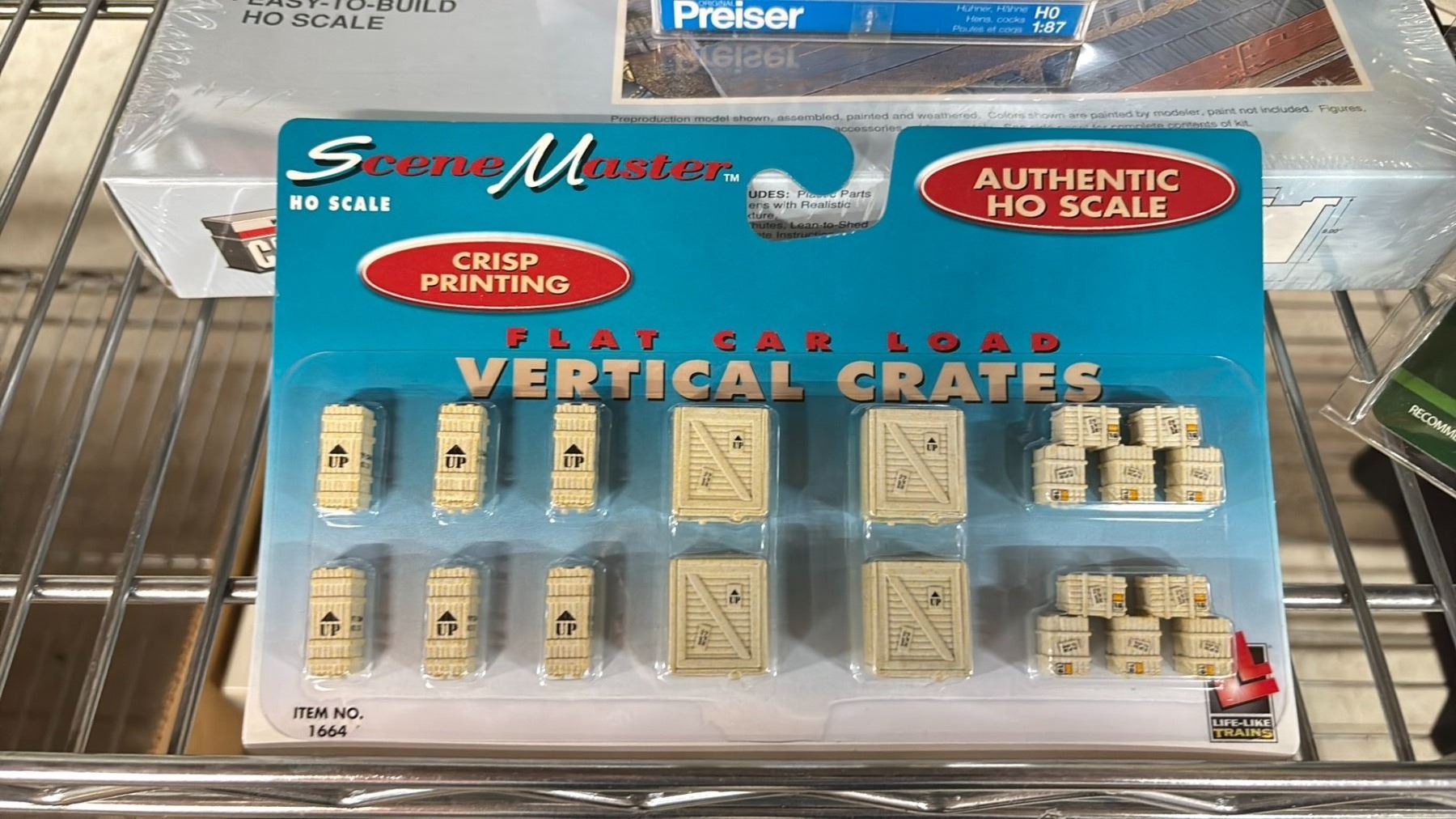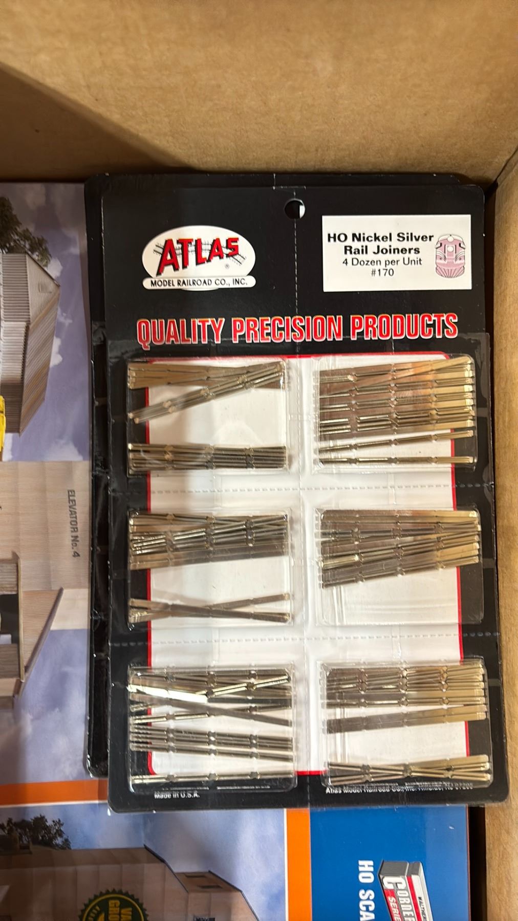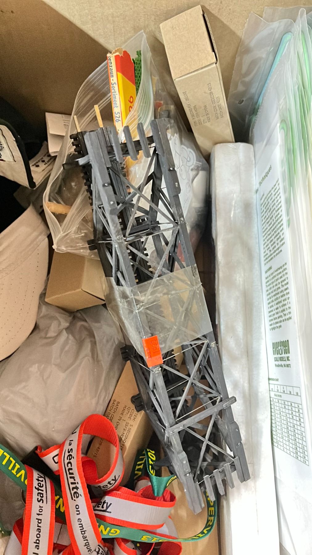 SHELF OF MODEL TRAIN SCENIC STRUCTURES, BILLBOARDS, RAIL JOINERS - FINE STANDARD & FINE SCALE, LANYARDS, HAT & MORE