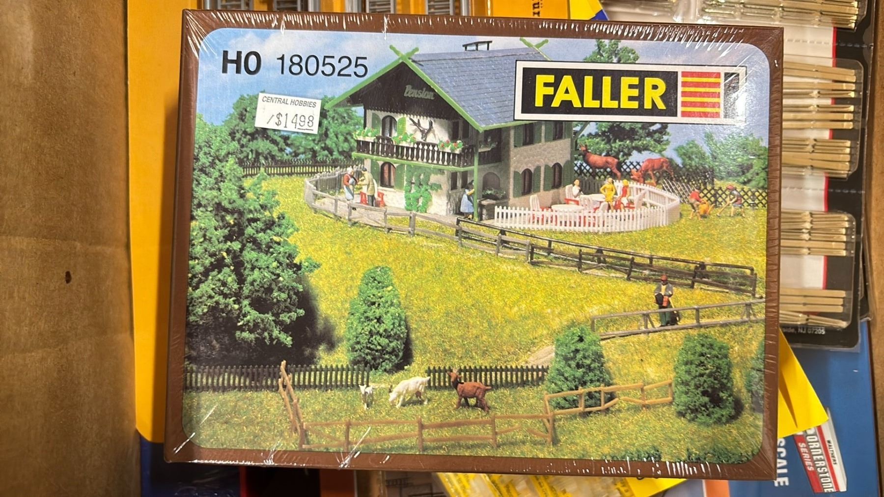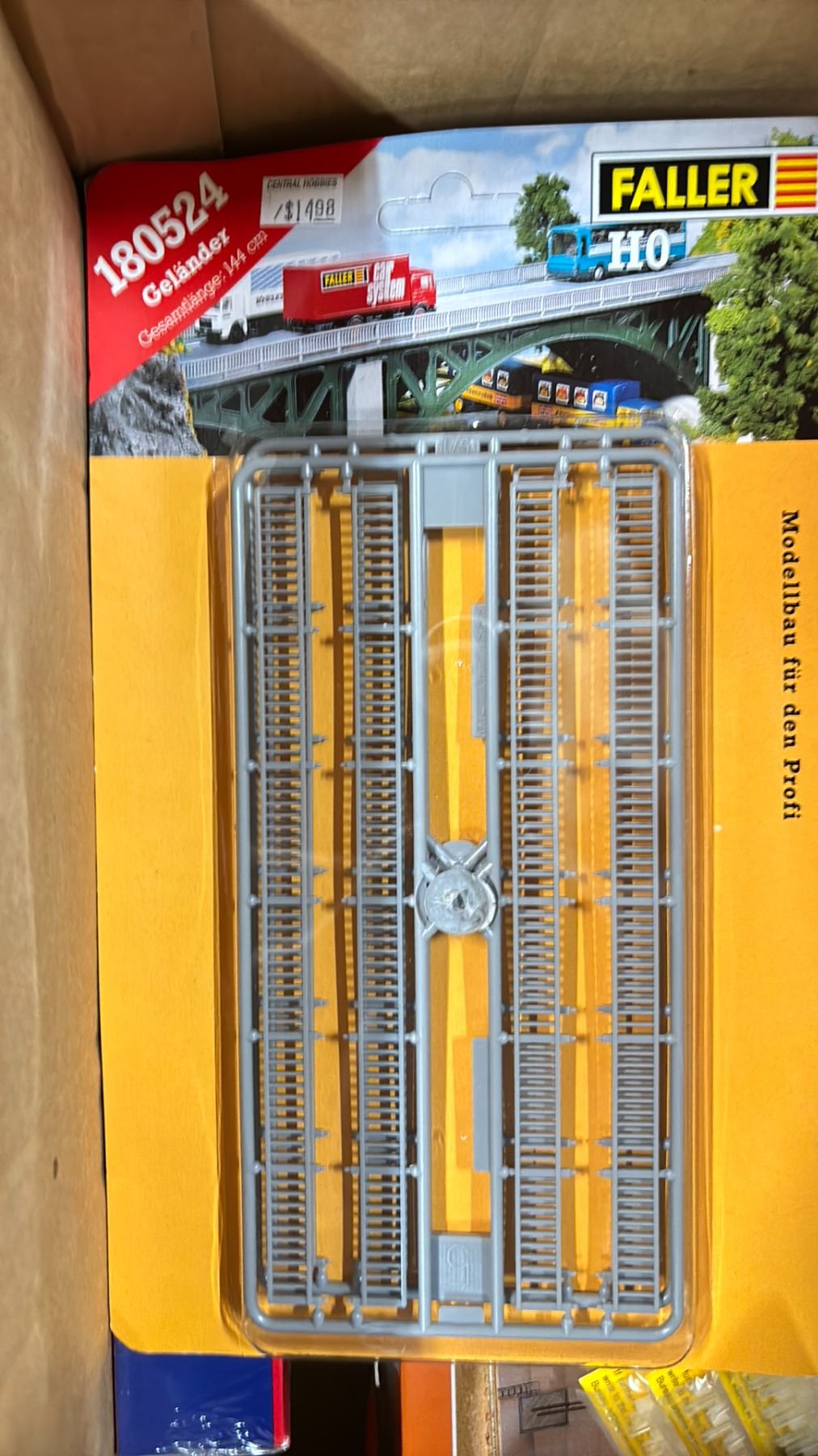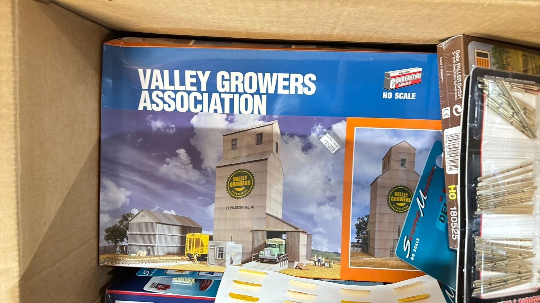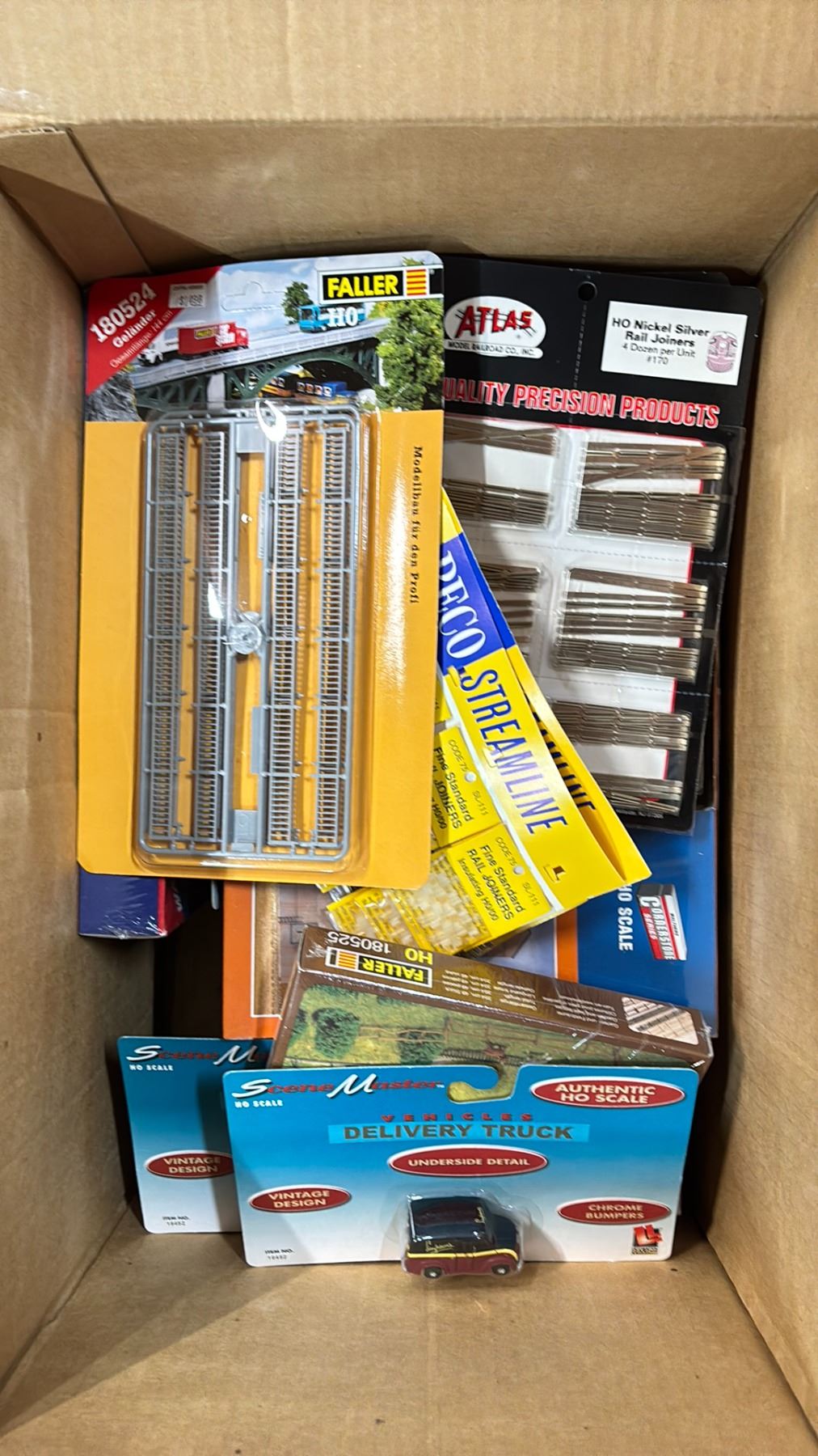SHELF OF MODEL TRAIN SCENIC STRUCTURES, BILLBOARDS, RAIL JOINERS - FINE STANDARD & FINE SCALE,