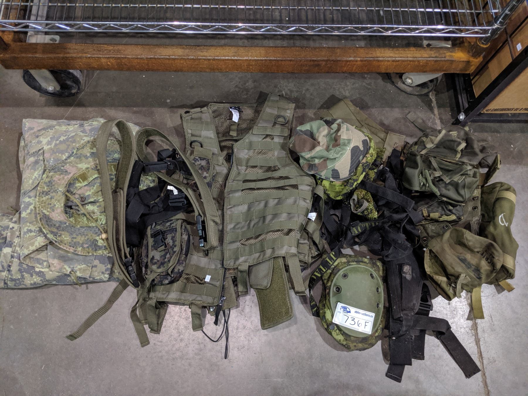 SHELF OF PAINTBALL GEAR INCLUDING CAMOUFLAGE, UTILITY CLOTHING, PADDING AND MORE