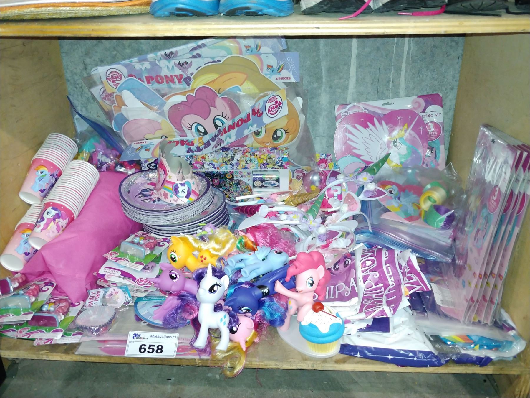 SHELF OF PARTY SUPPLIES INCLUDING MY LITTLE PONY CUPS, PLATES, DECOR AND MY LITTLE PONIES