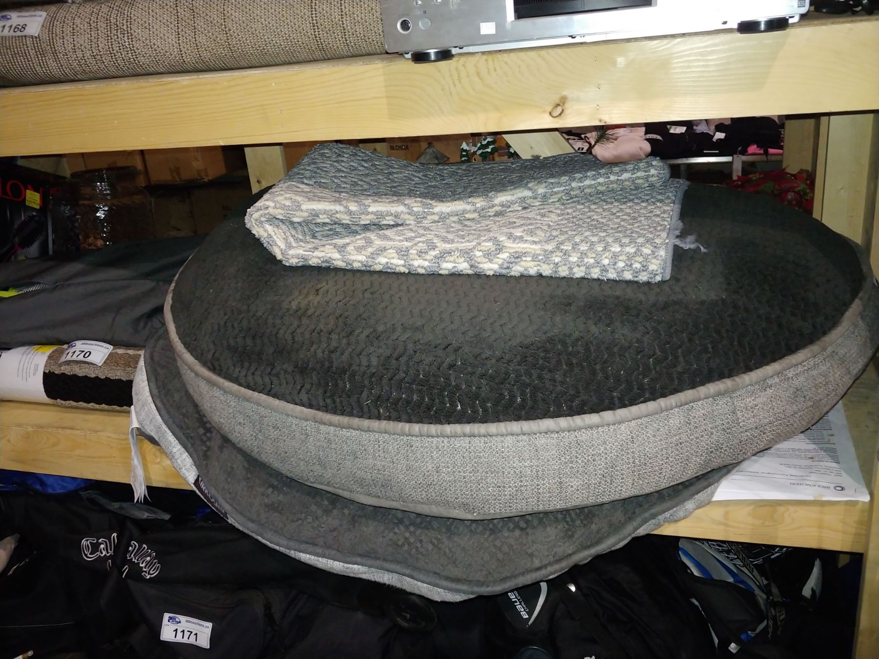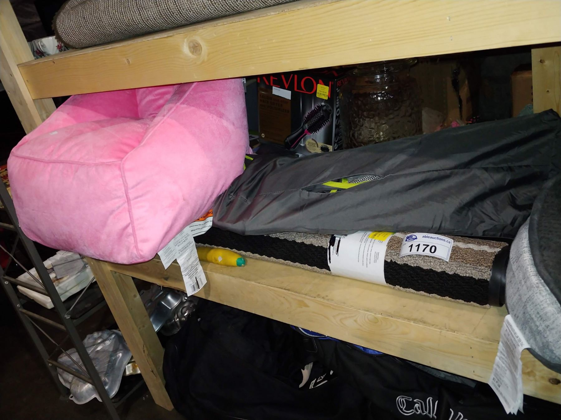 SHELF OF PET BEDS, RUGS, CRIB AND MORE