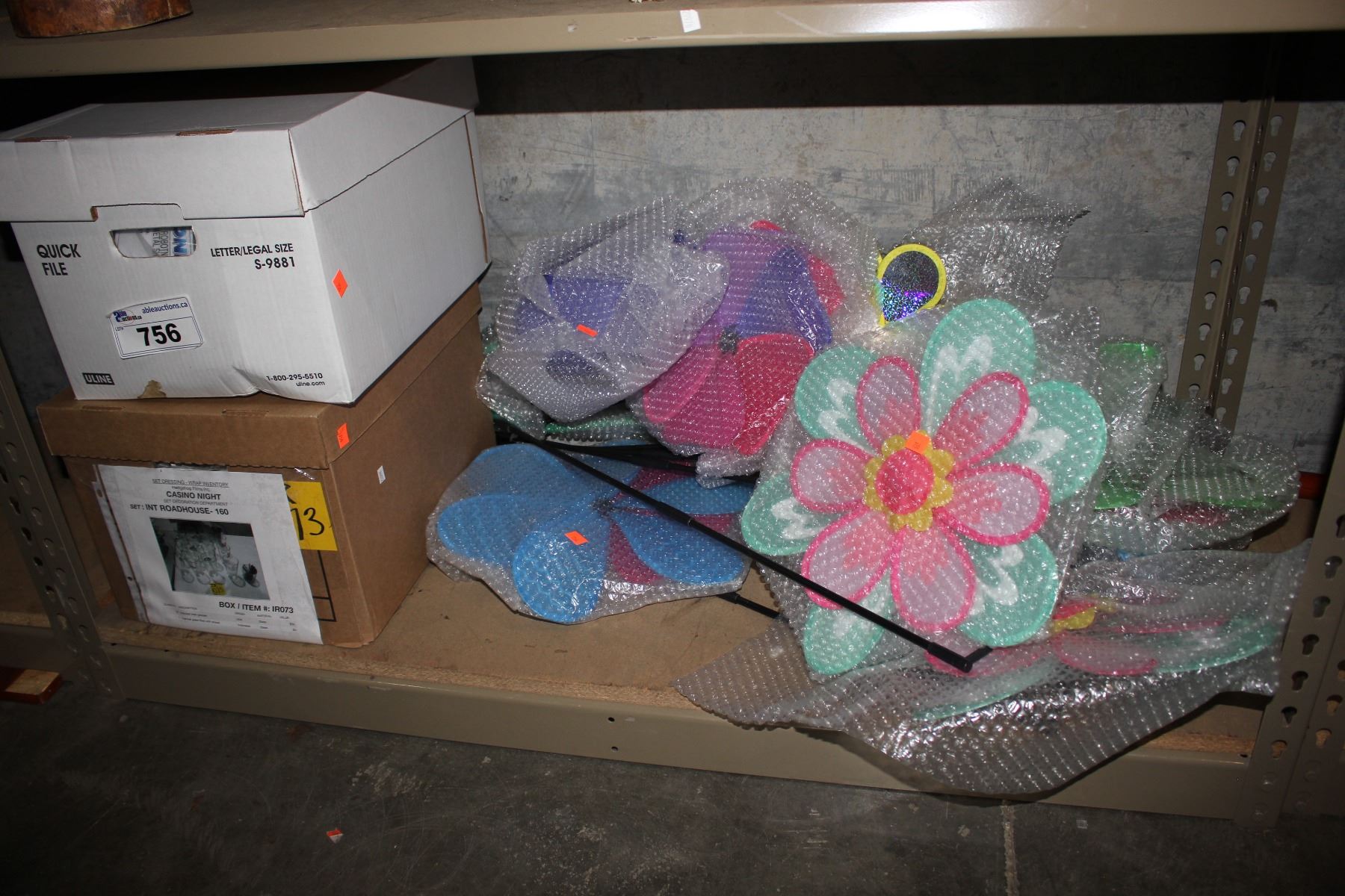 SHELF OF PROPS INCLUDING QUILL EQUIPMENT, BEER GLASSES, FLORAL DECOR, AND MORE