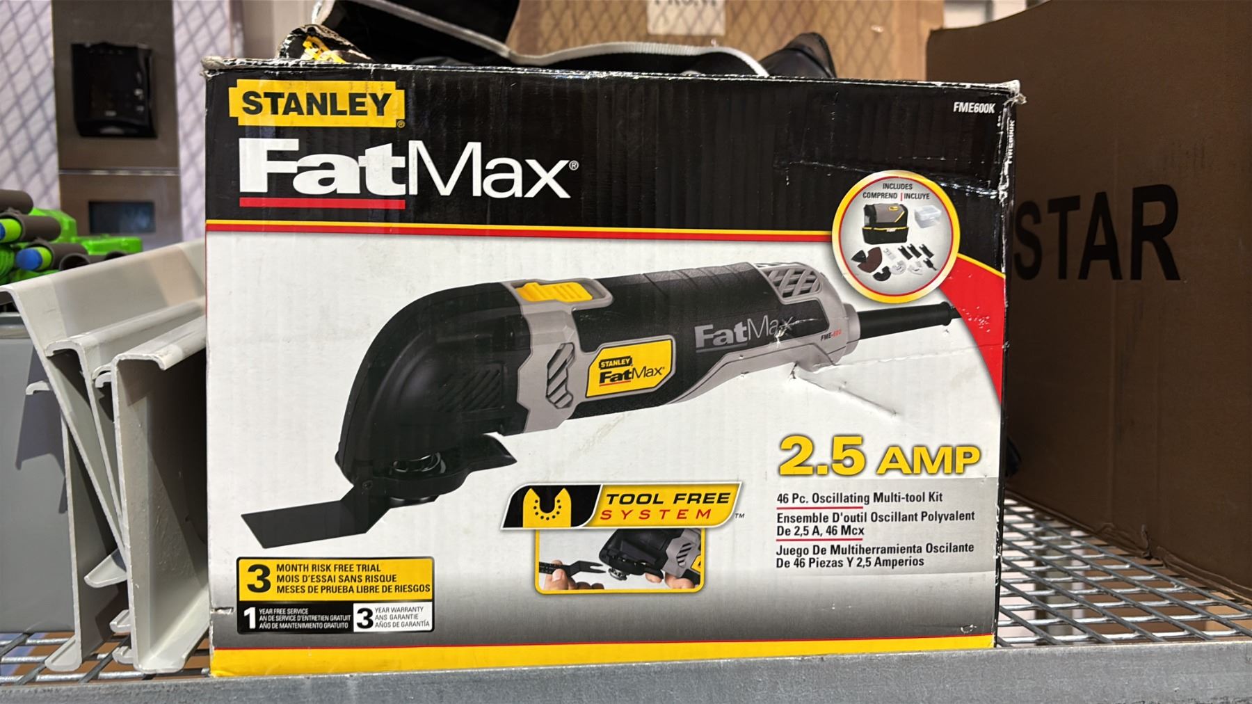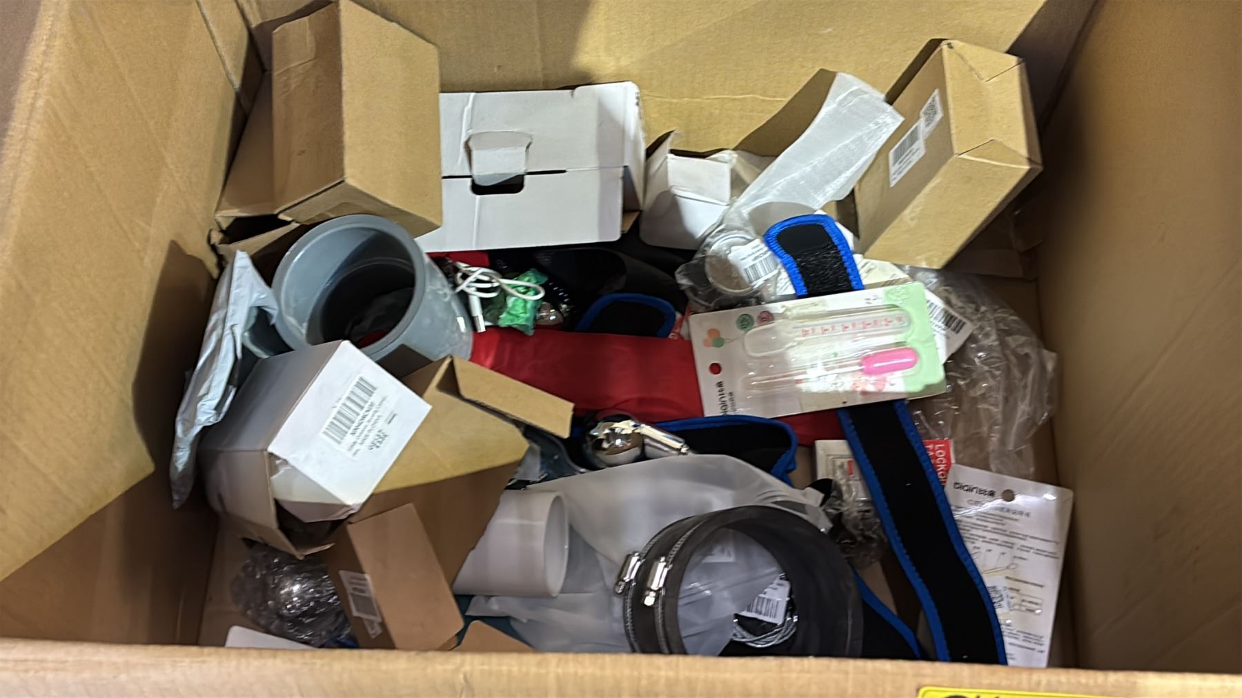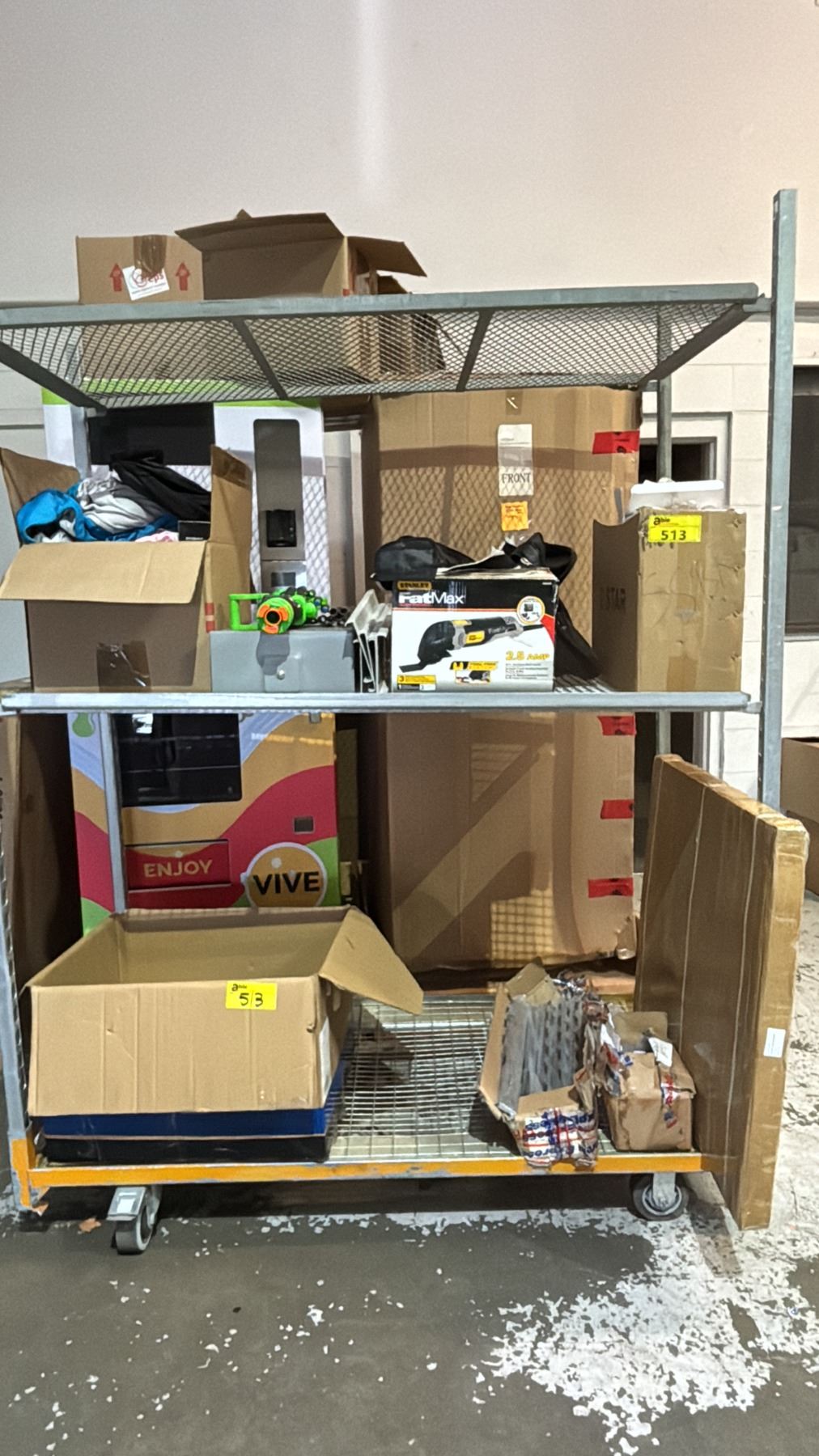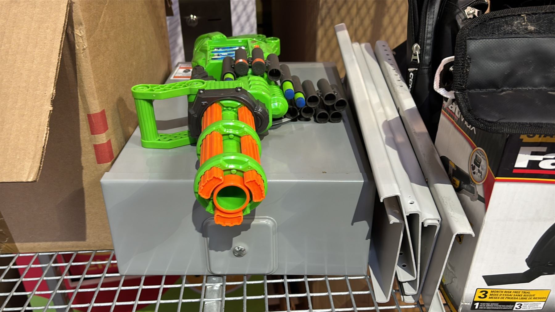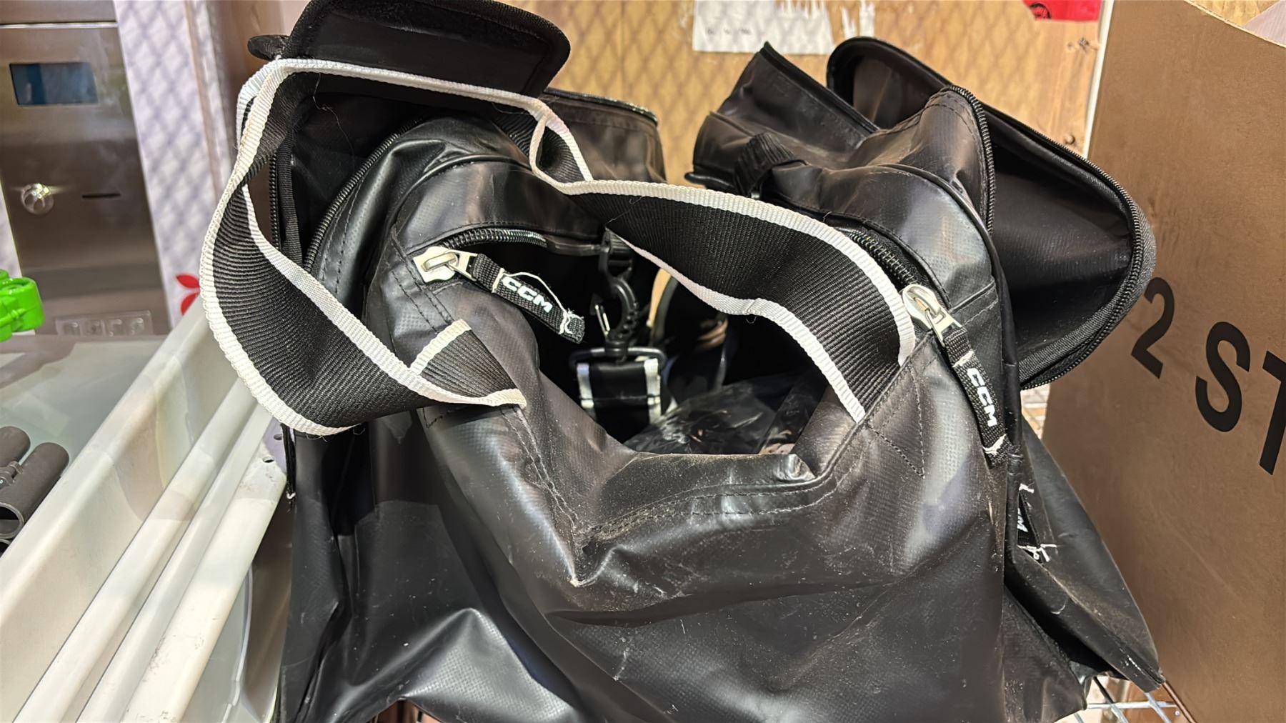 SHELF OF RETURNS - ASSORTED CLOTHING, CASE OF DOOR KNOBS, CCM HOCKEY BAG, STANLEY FAT MAX MULTI TOOL KIT, NERF GUN, ELECTRICAL BOX, HEAVY DUTY DRAWER SLIDES, TRIANGLE WEIGHT PLATE TREE & MORE *MUST TAKE ALL*