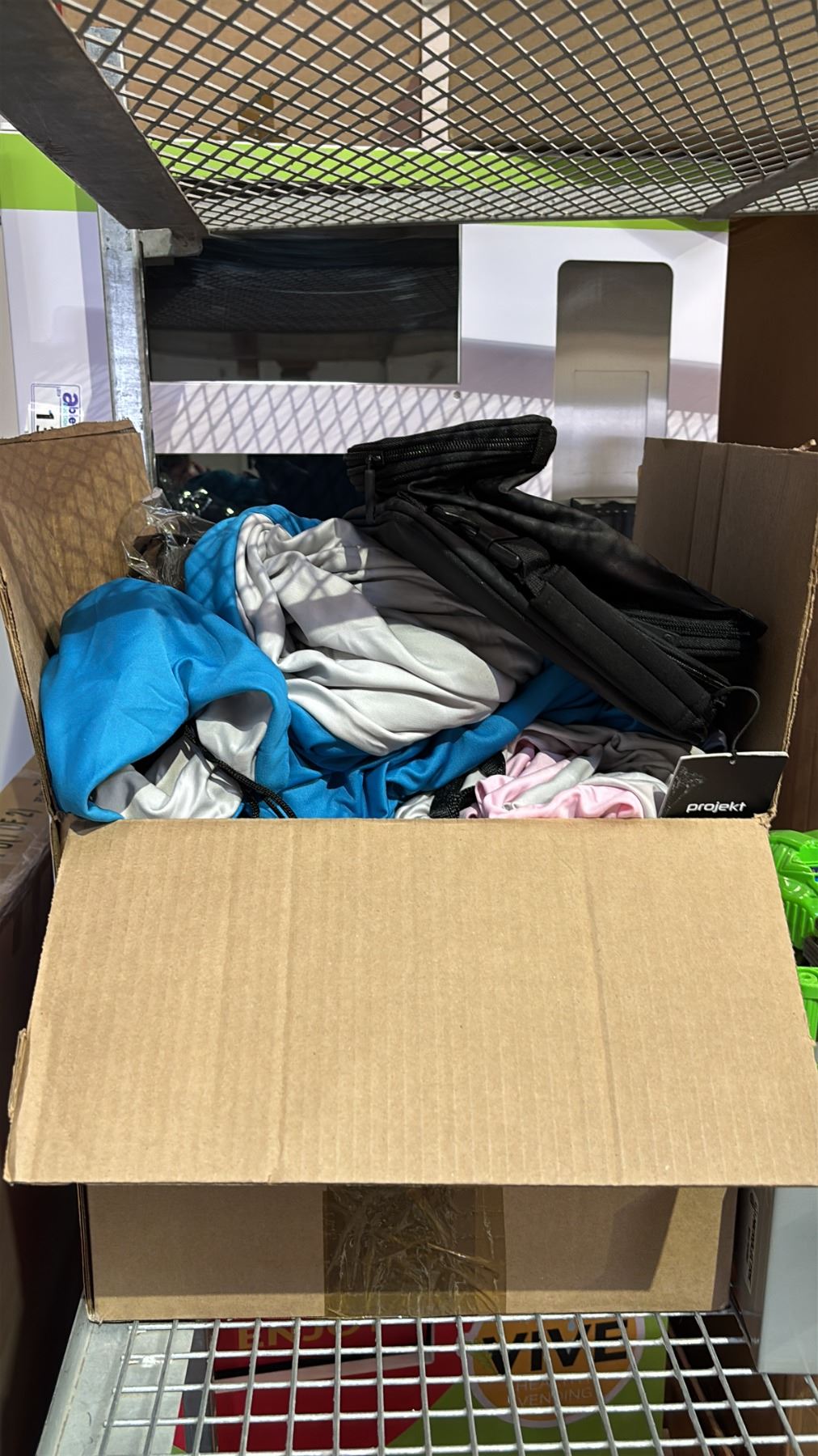 SHELF OF RETURNS - ASSORTED CLOTHING, CASE OF DOOR KNOBS, CCM HOCKEY BAG, STANLEY FAT MAX MULTI