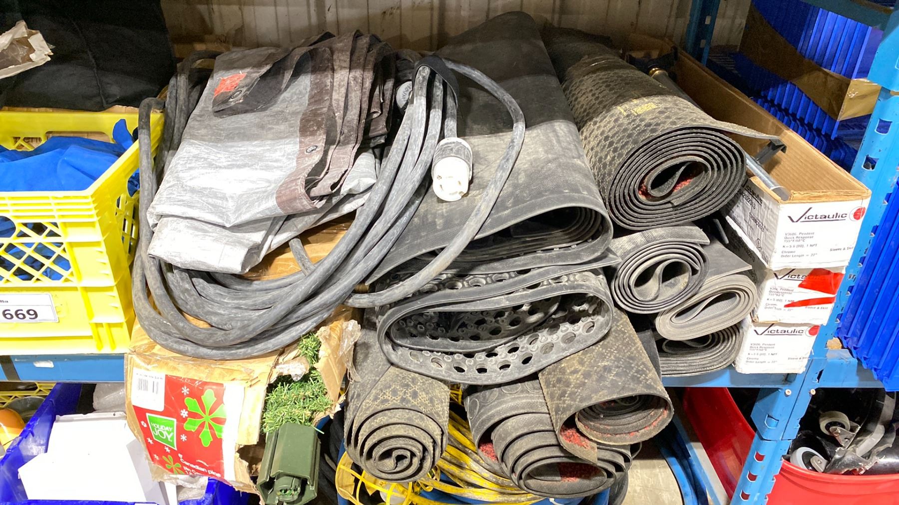 SHELF OF RUBBER ANTI SLIP MATTS, ELECTRICAL CABLE, CHRISTMAS TREE, RAGS, & HARDWARE