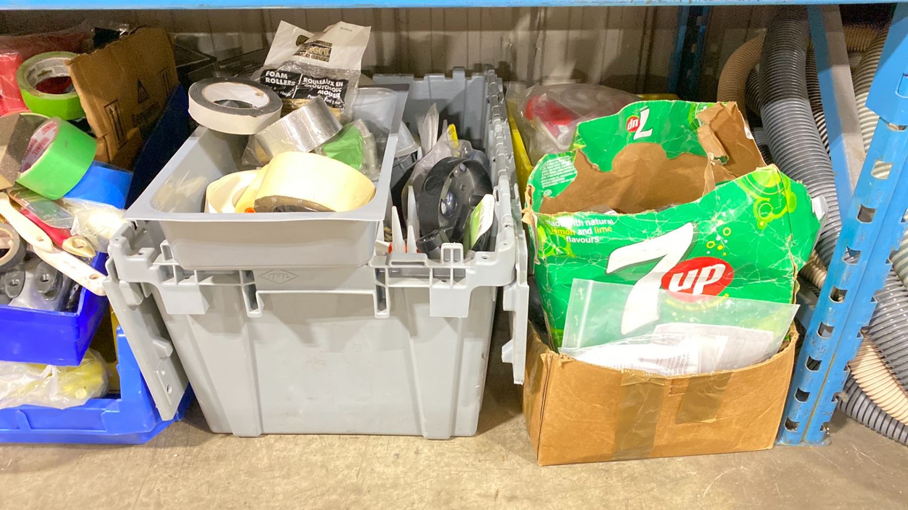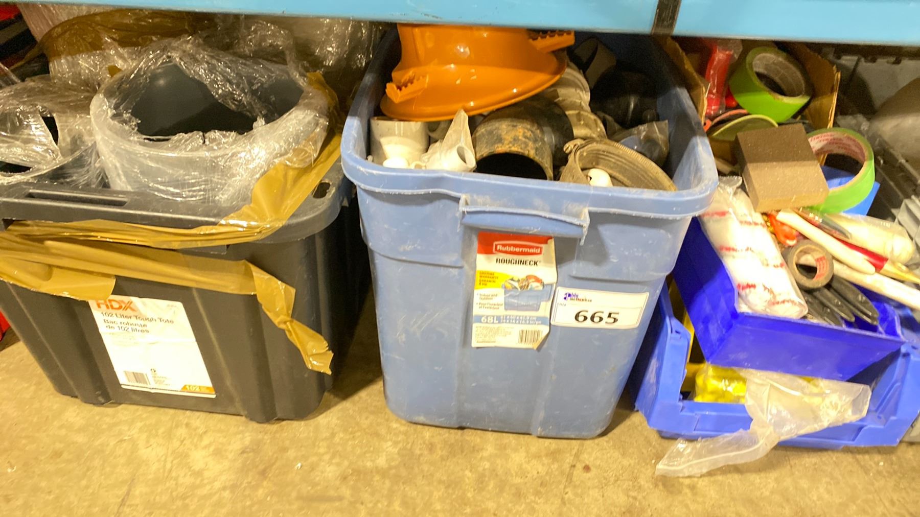 SHELF OF TAPES, PVC PIPE CONNECTORS, ASSORTED HARDWARE INCLUDING VARIOUS HANDLES & CAULKING