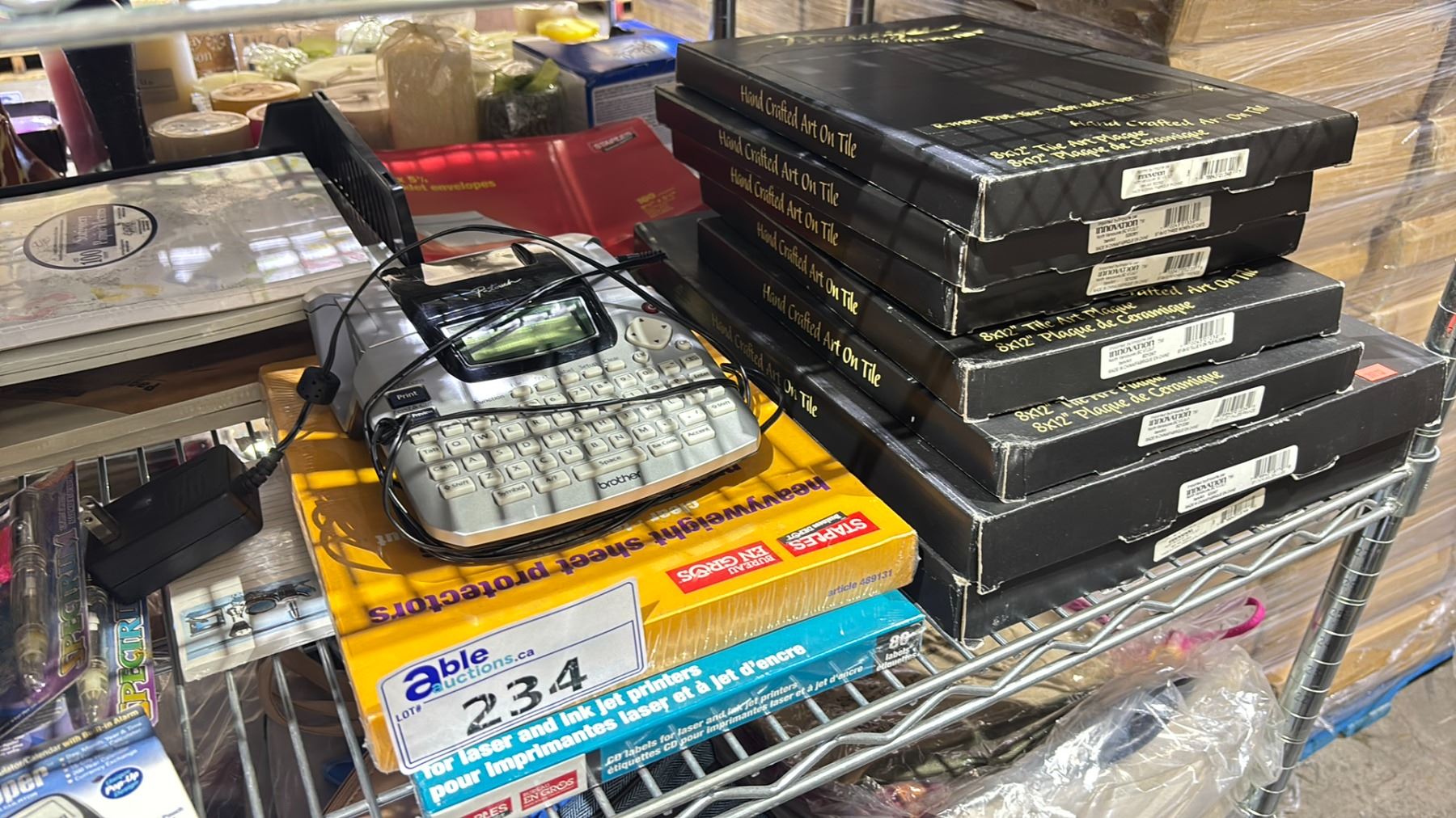 SHELF OF TILE ART, P-TOUCH MACHINE, PAPER, PENS MEMO PADS & MORE