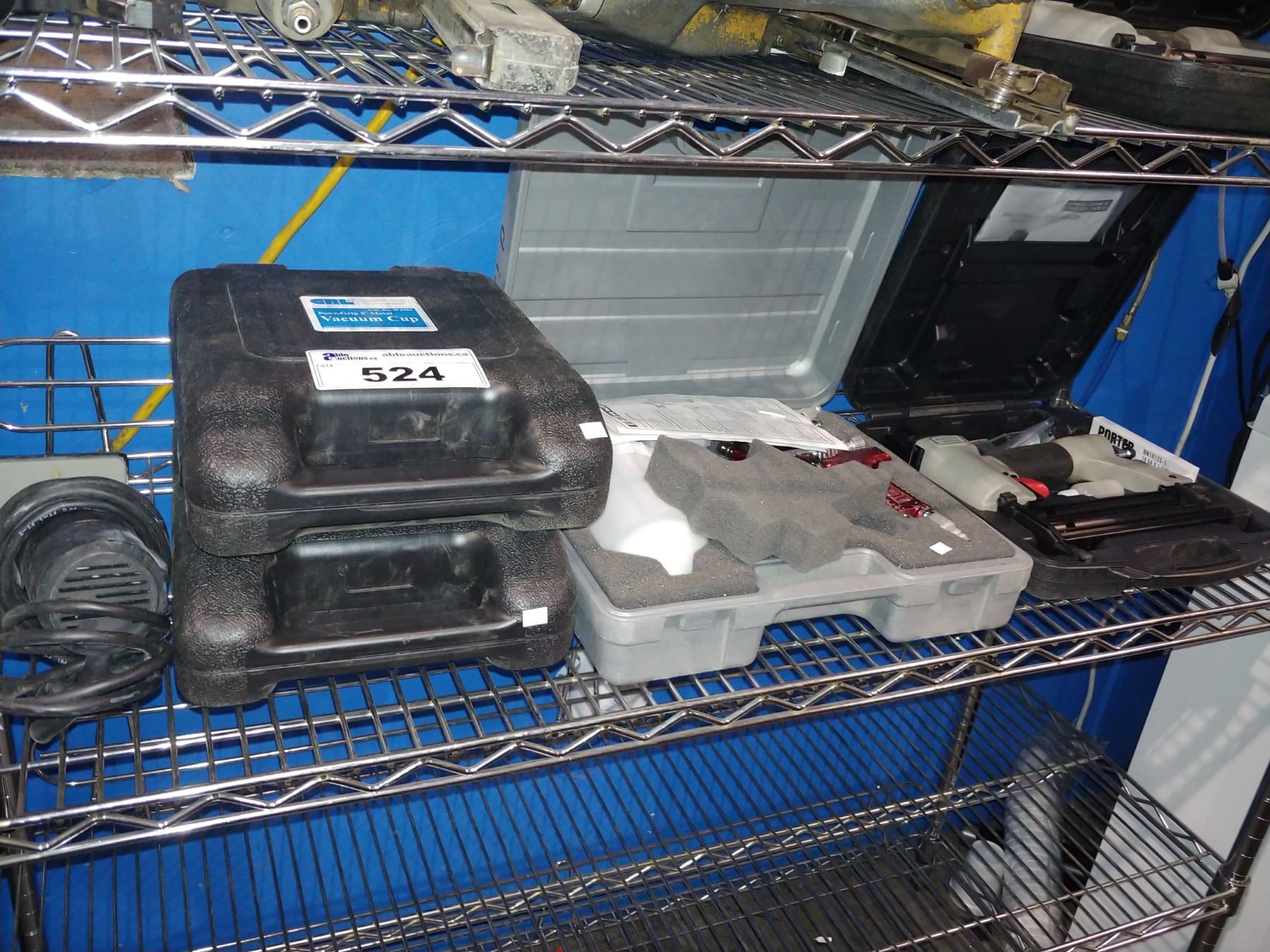 SHELF OF TOOLS INCLUDING CRL 8" METAL VACUUM CUPS, PORTER + CABLE LAMINATE TRIMMER BASE, SPRAY GUN AND BRAD NAILER