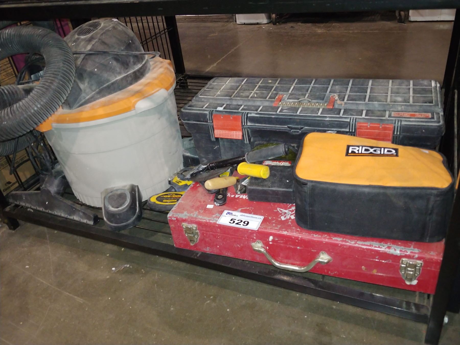 SHELF OF TOOLS INCLUDING RIDGID SHOP VAC, SANDER, PAIR OF TOOL BOXES AND MORE