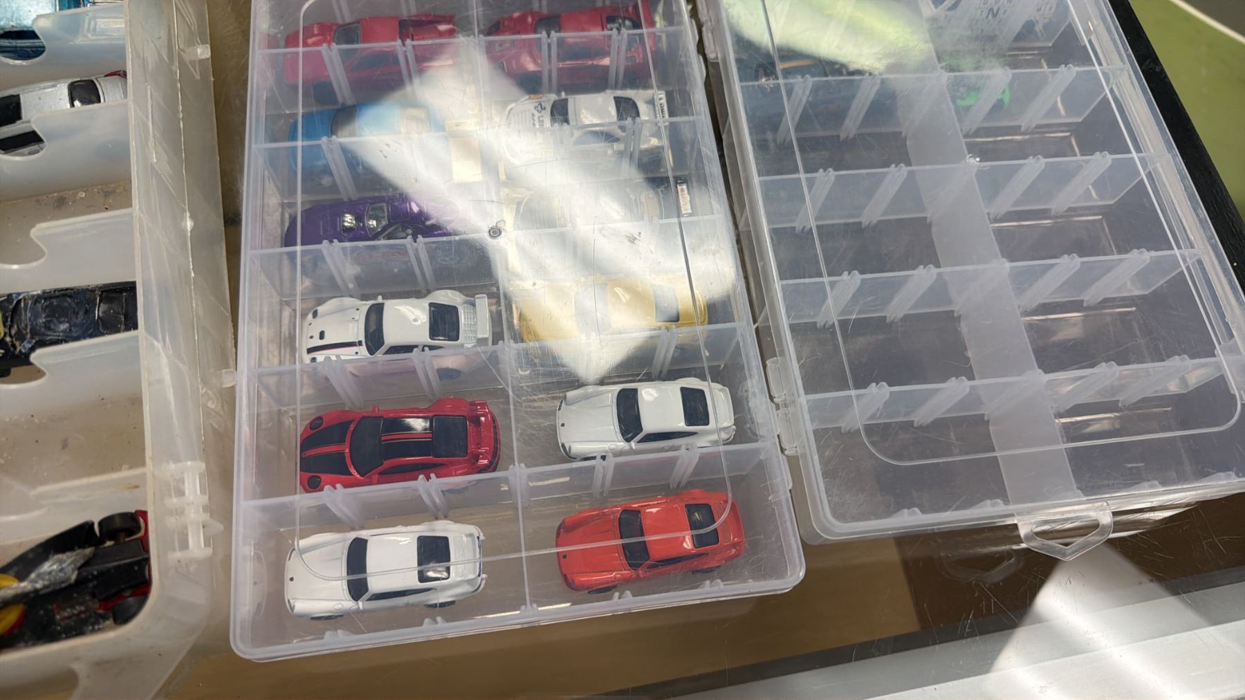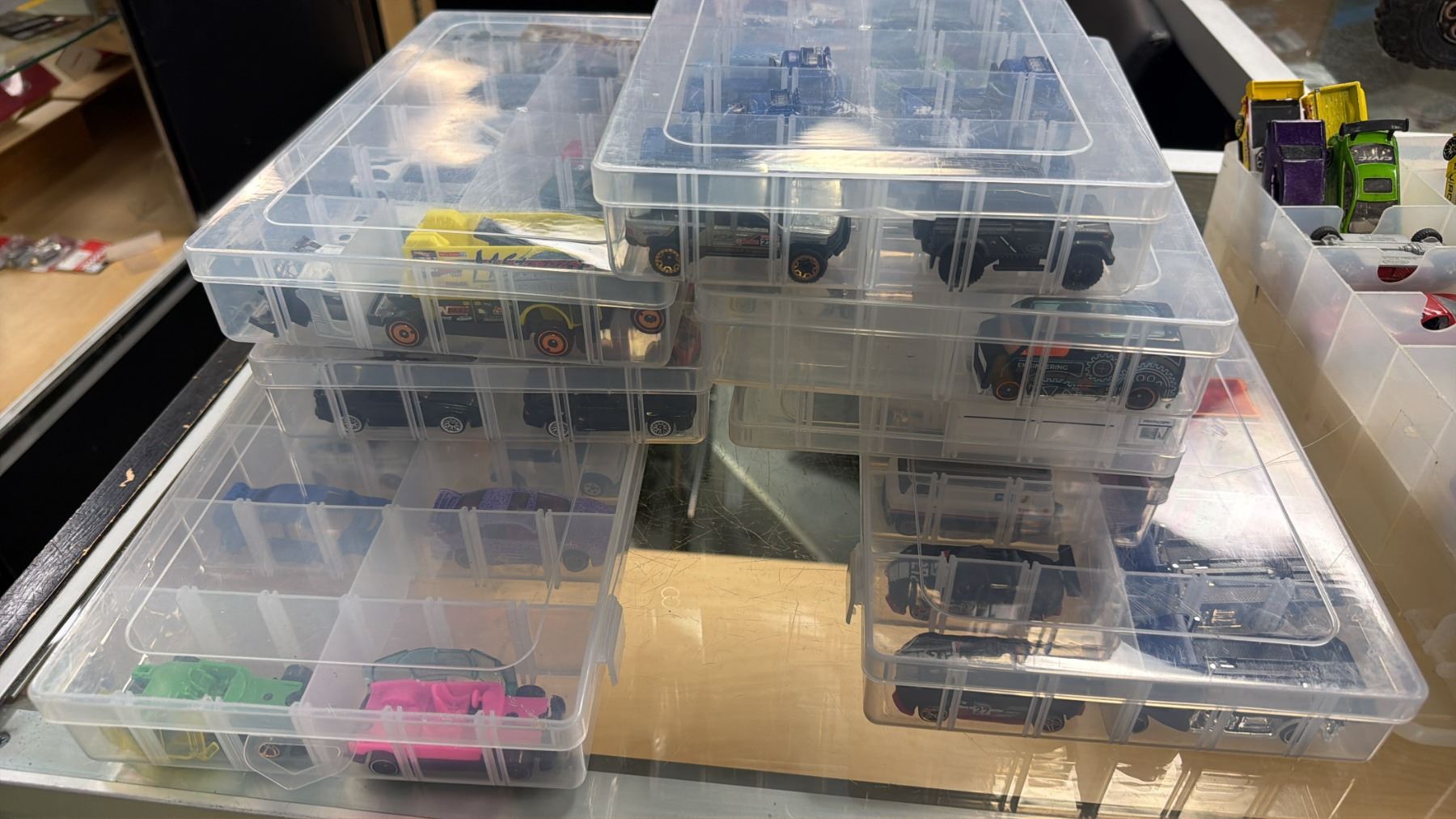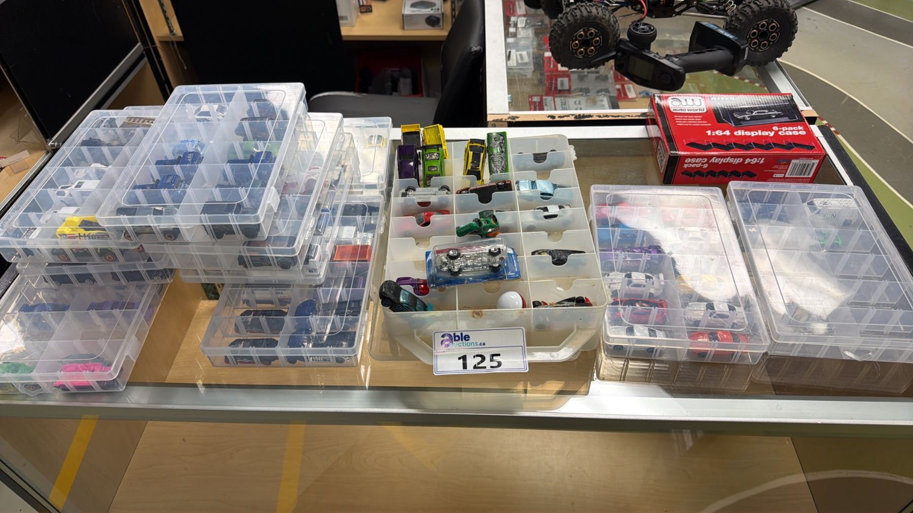 SHELF OF TOY ORGANIZERS WITH ASSORTED HOT WHEELS CARS CONTENTS & 6-PACK 1:64 MODEL DISPLAY CASE