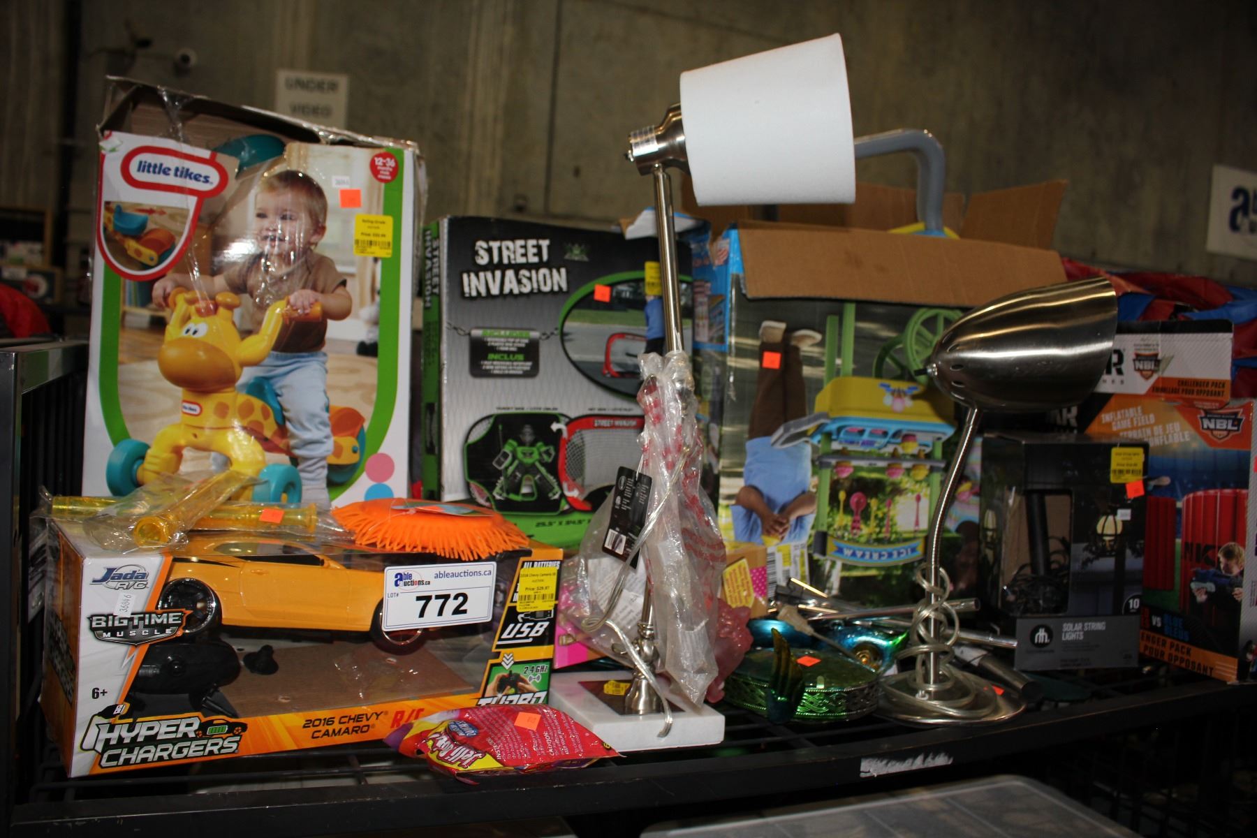 SHELF OF TOYS INCLUDING HOCKEY NET, ICE CREAM STAND, AND MORE