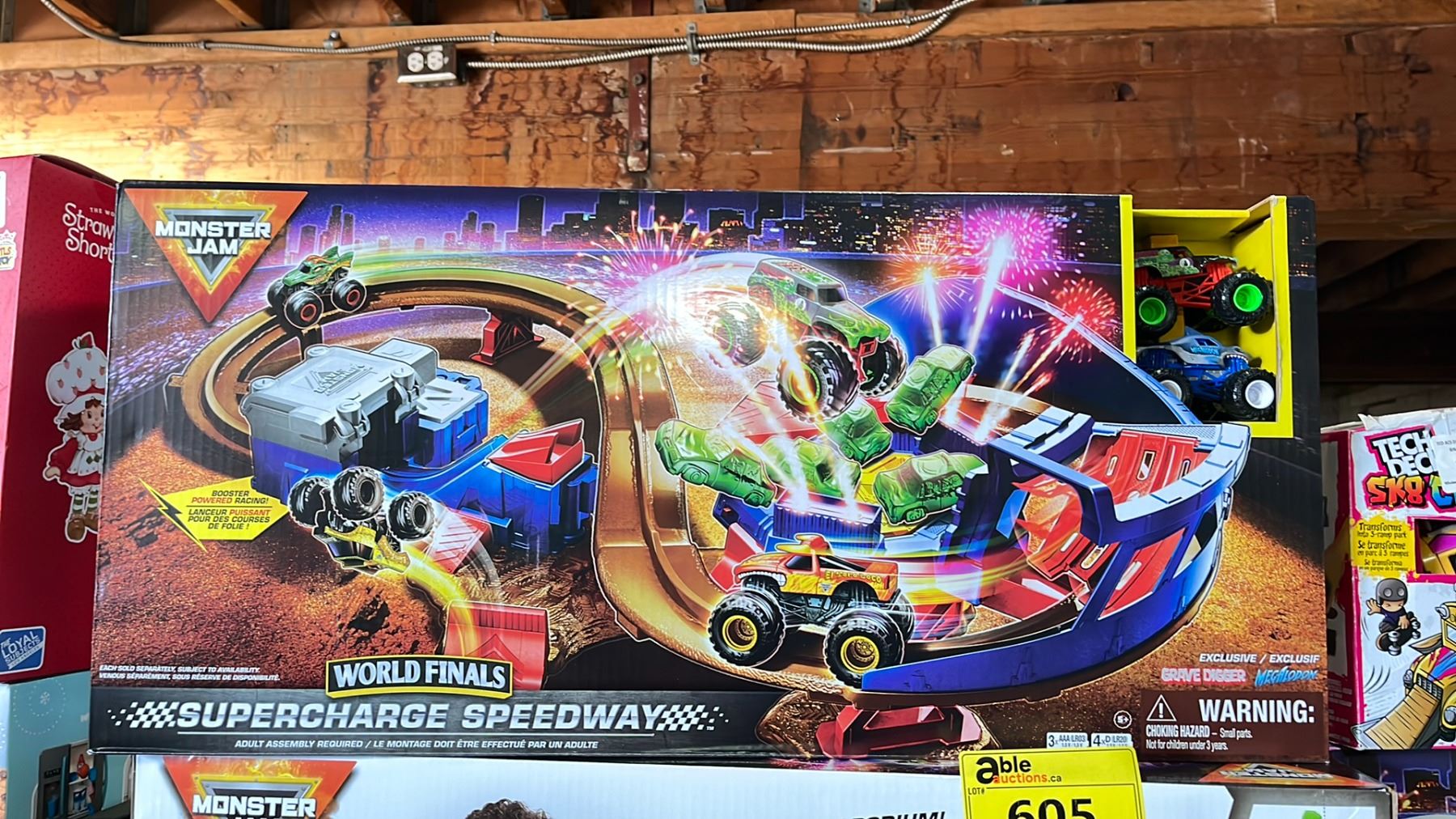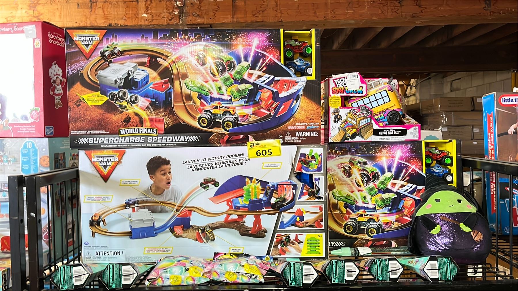 SHELF OF TOYS INCLUDING: MONSTER JAM SPEEDWAY, GLINDA SQUISHMALLOW, CRAYOLA BUBBLE WAND & MORE