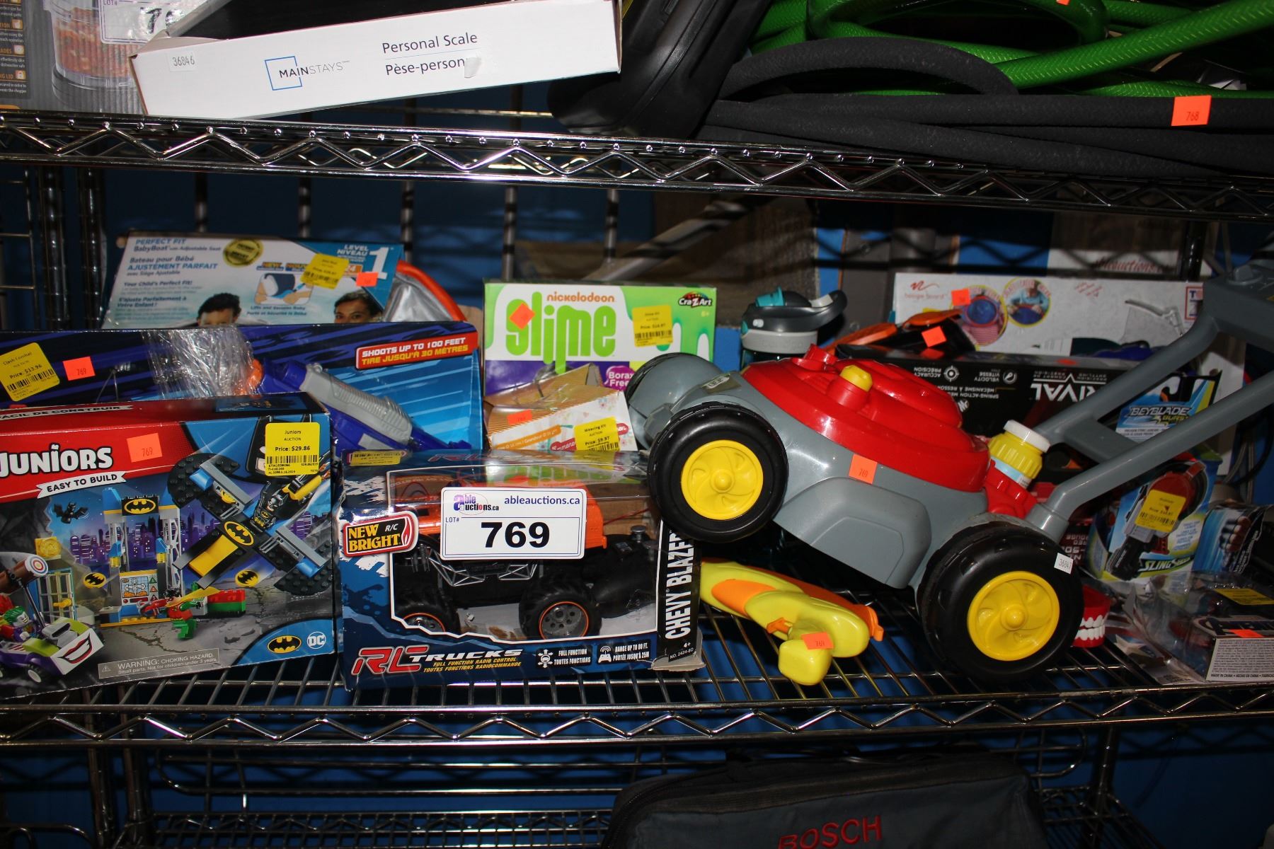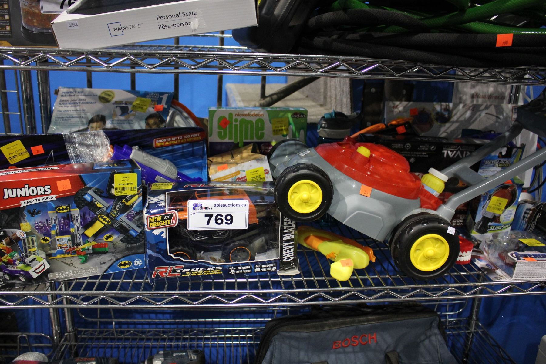 SHELF OF TOYS INCLUDING WATER GUNS, SLIME, AND MORE