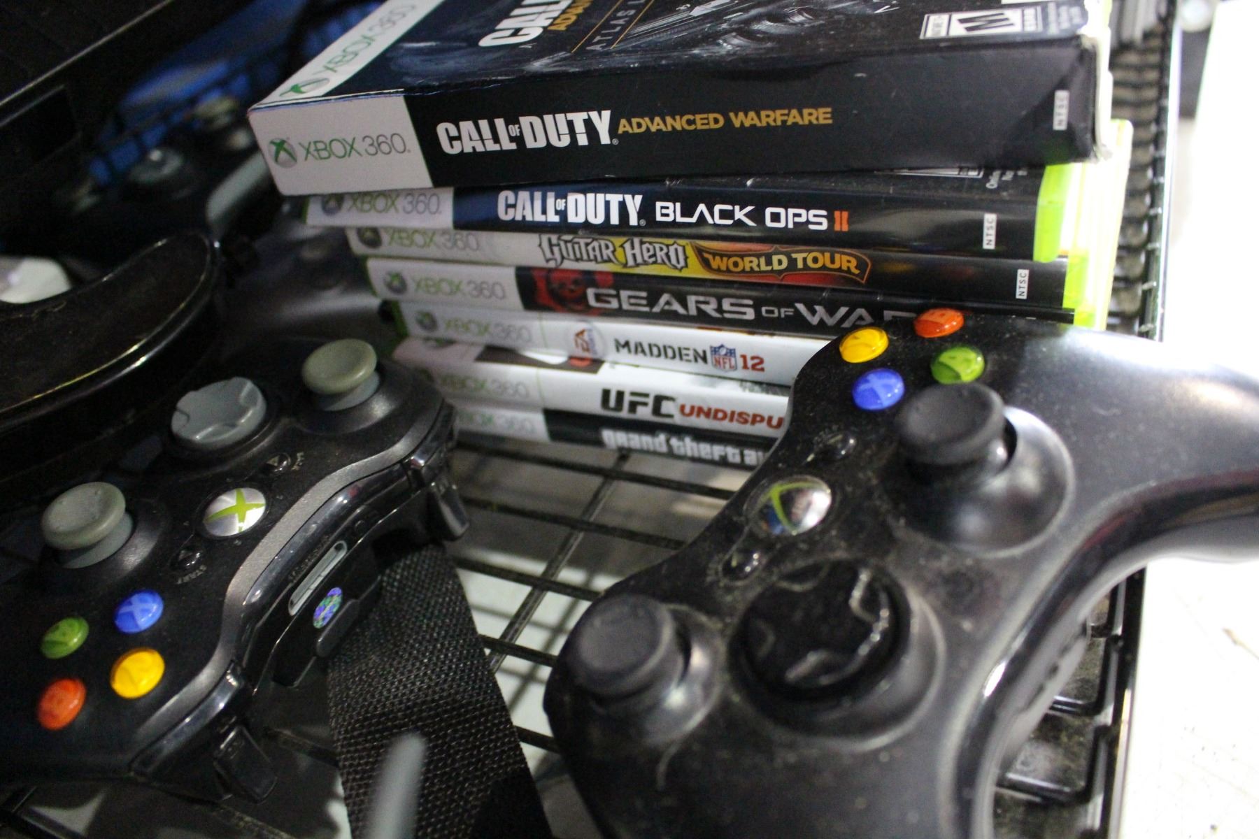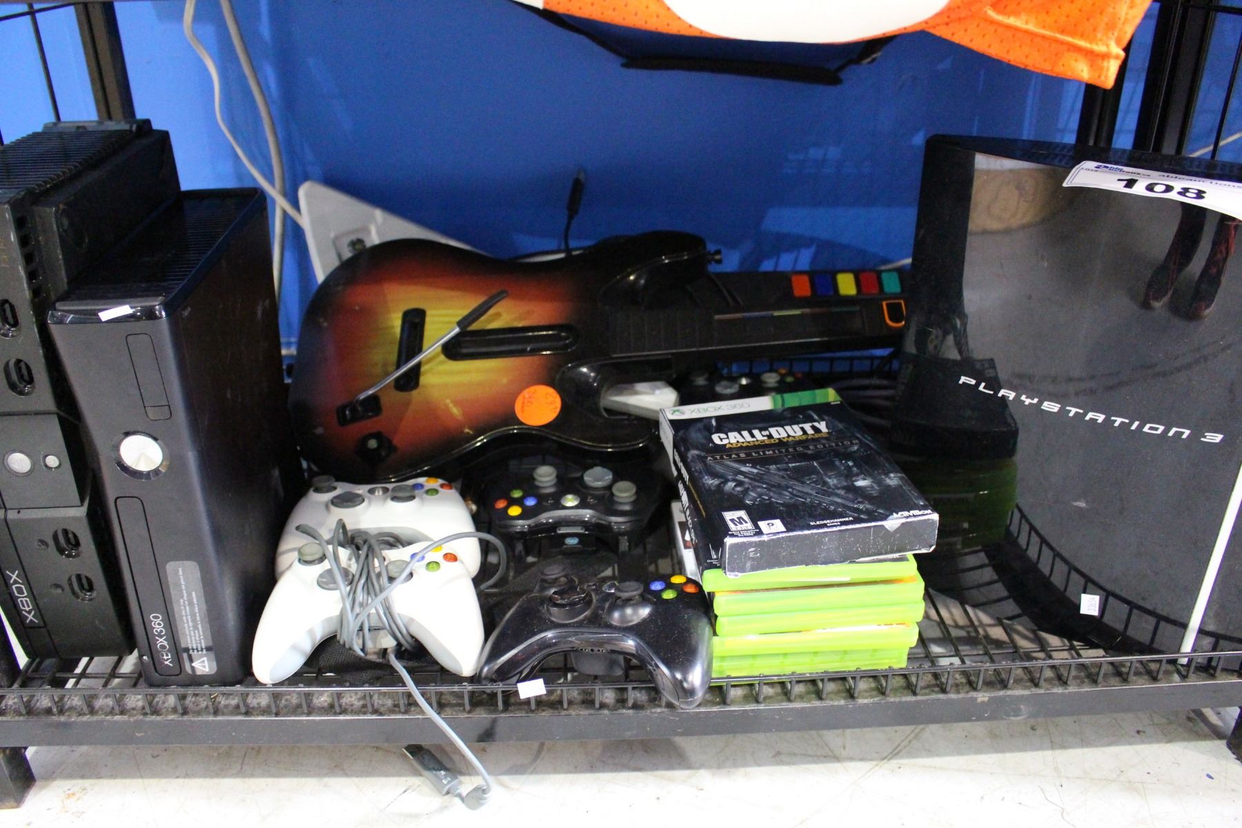 SHELF OF VIDEO GAMES, GAME CONSOLES AND CONTROLLERS - XBOX 360, PLAYSTATION 3, AND MORE