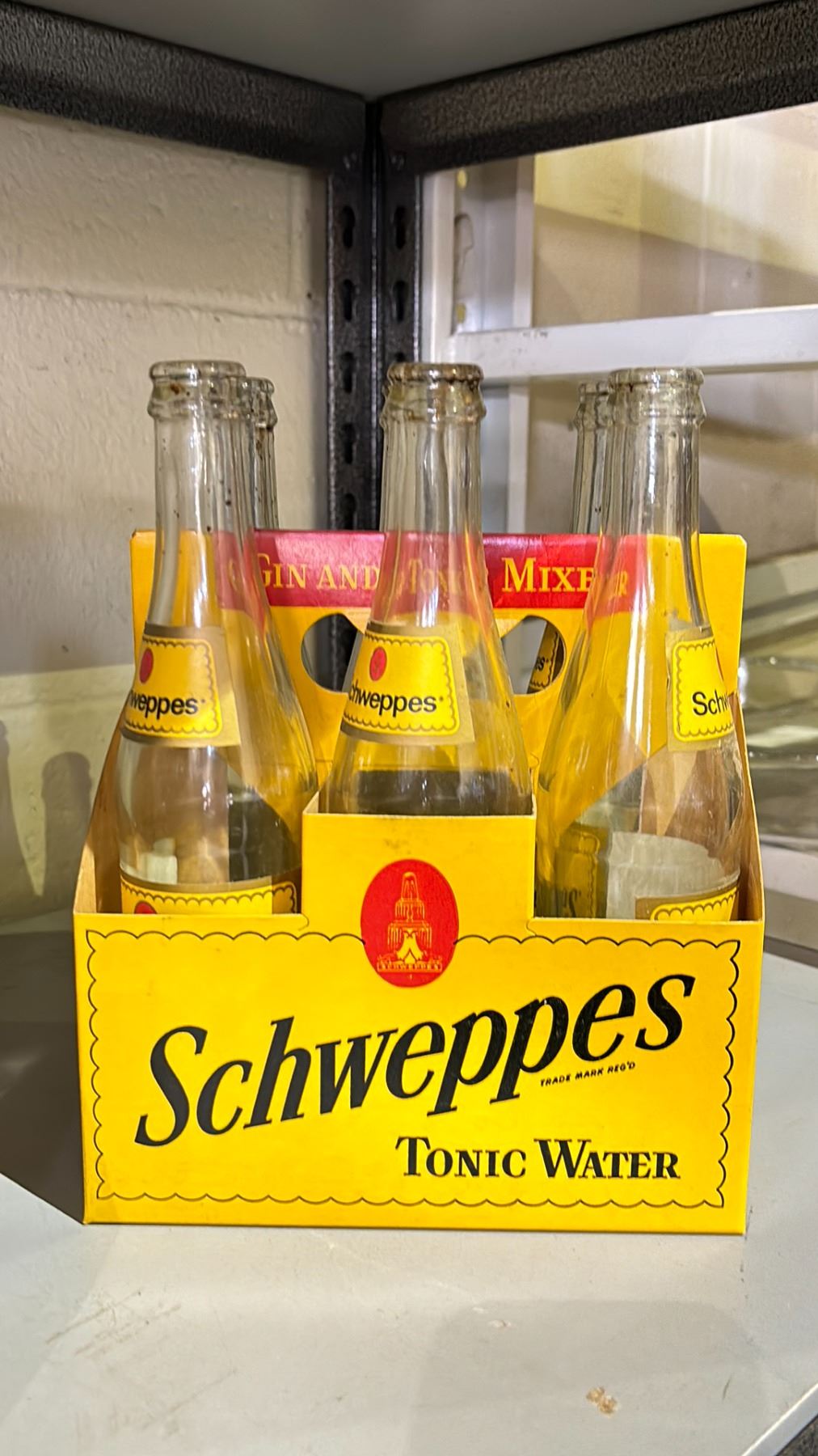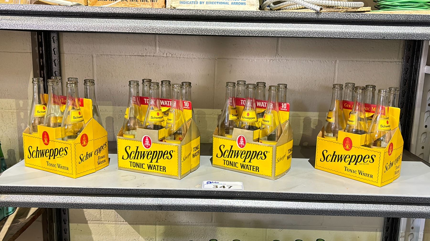 SHELF OF VINTAGE SCHWEPPES TONIC WATER BOTTLES WITH CARRIERS