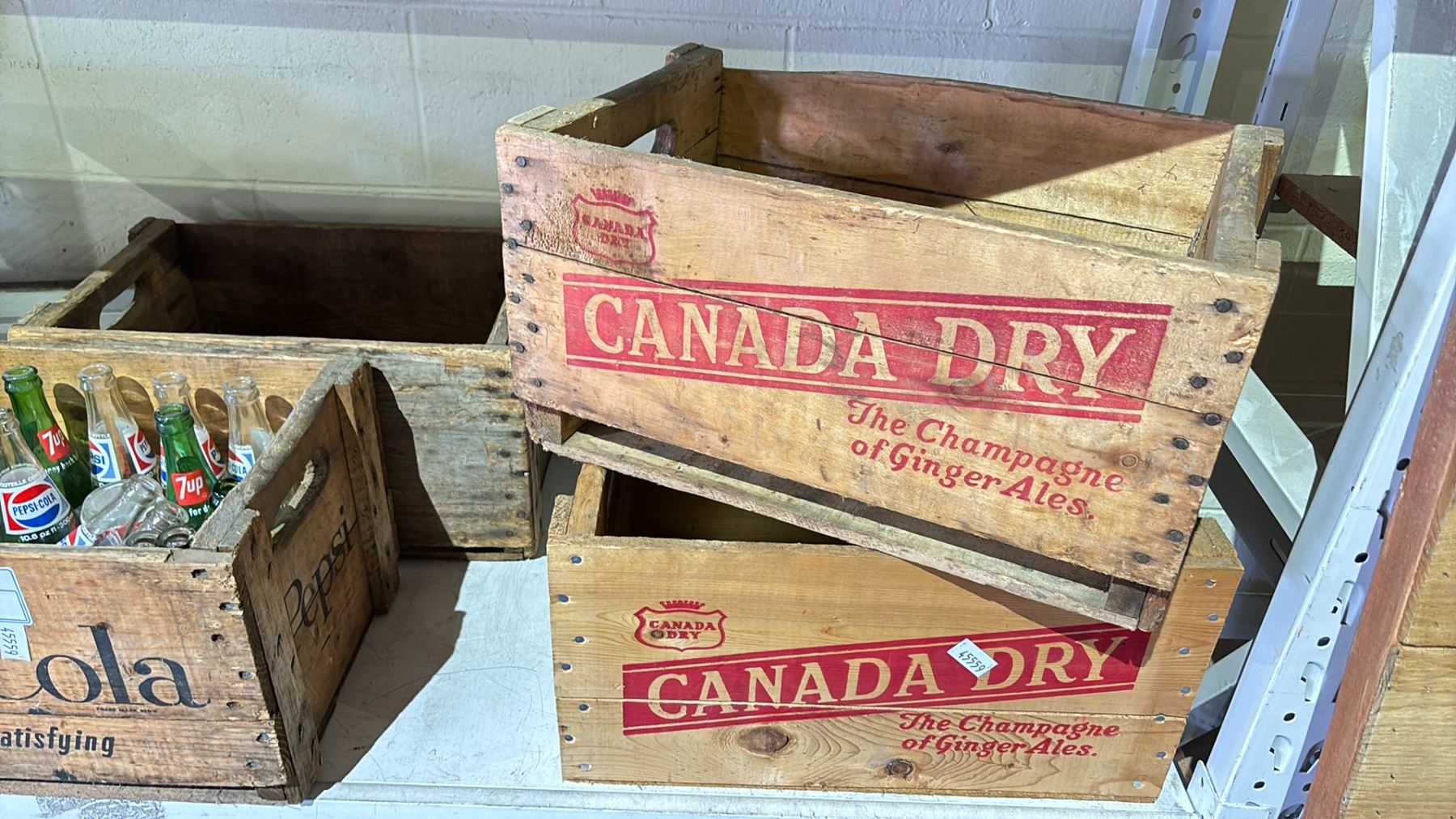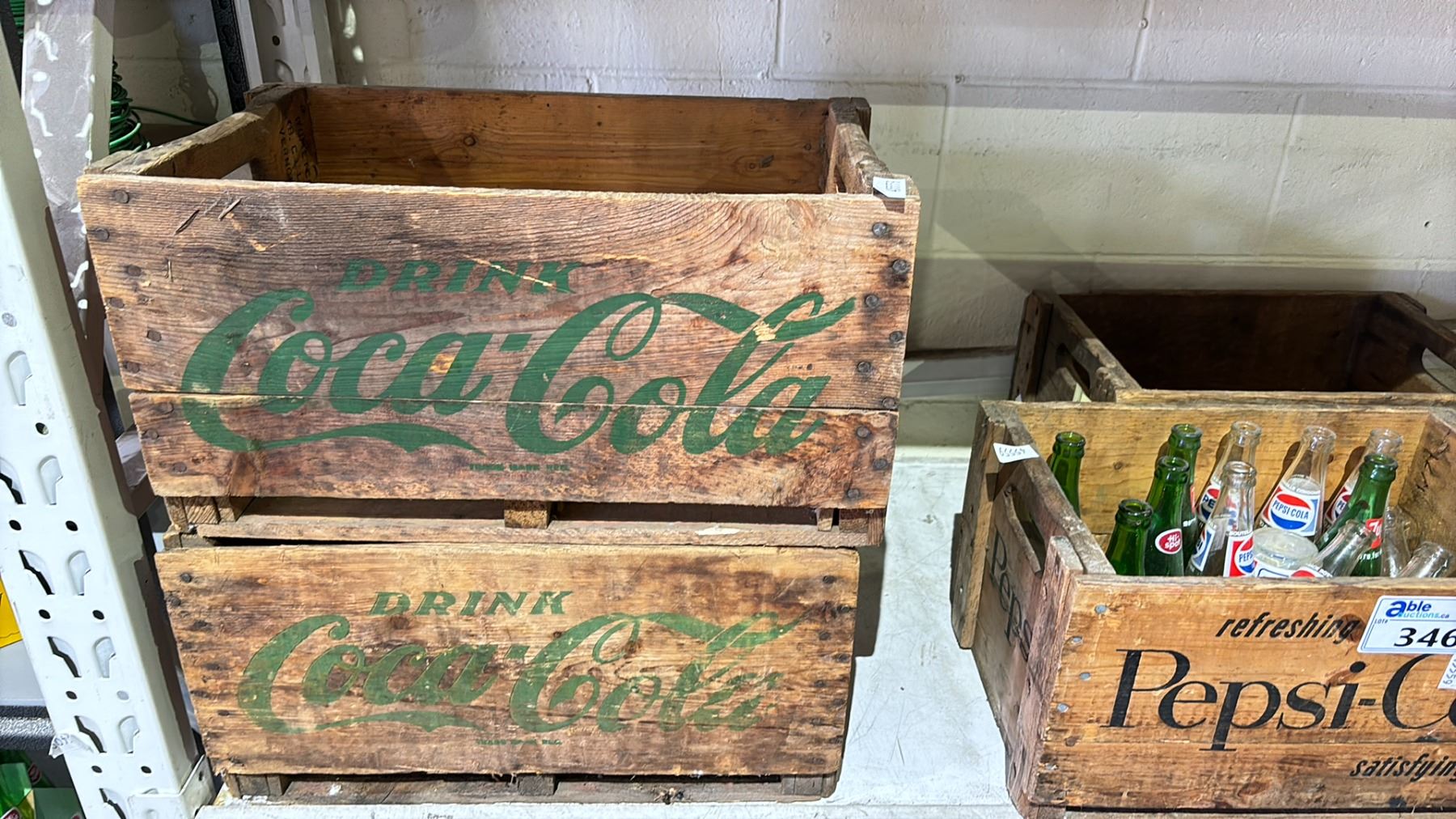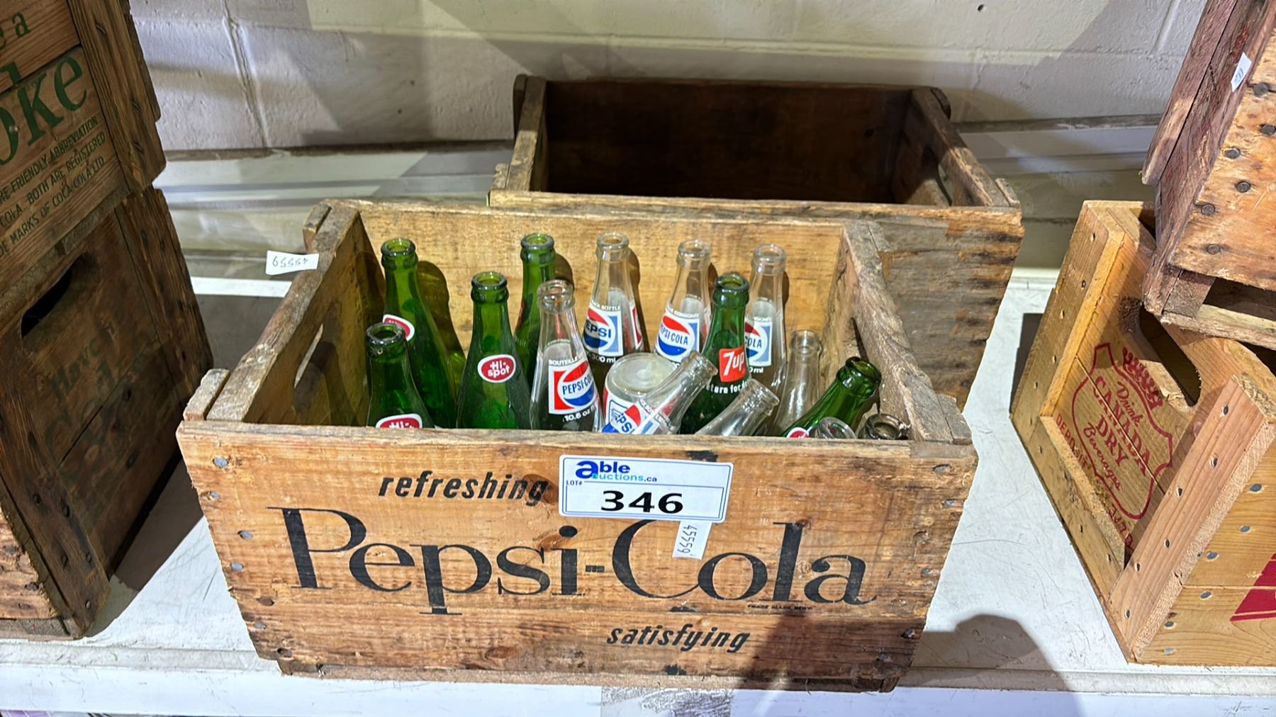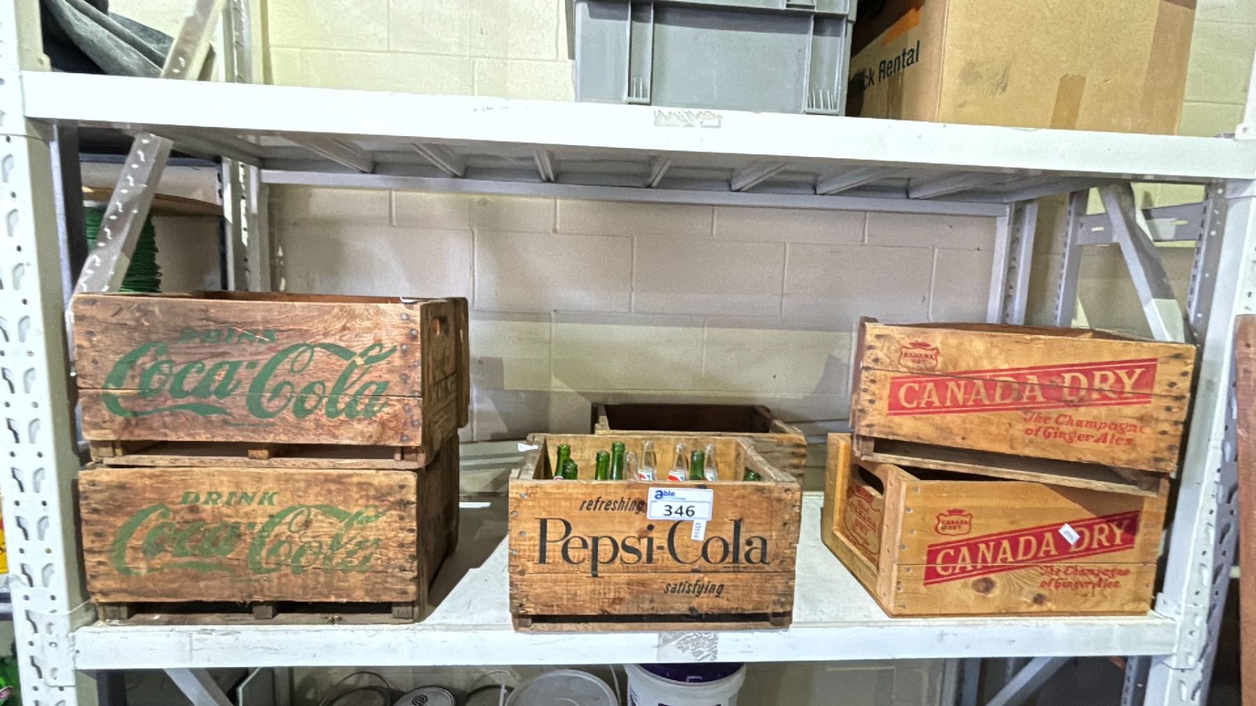 SHELF OF VINTAGE SODA CRATES & BOTTLES INCLUDING; PEPSI-COLA, HI-SPOT, CANADA DRY & COCA-COLA