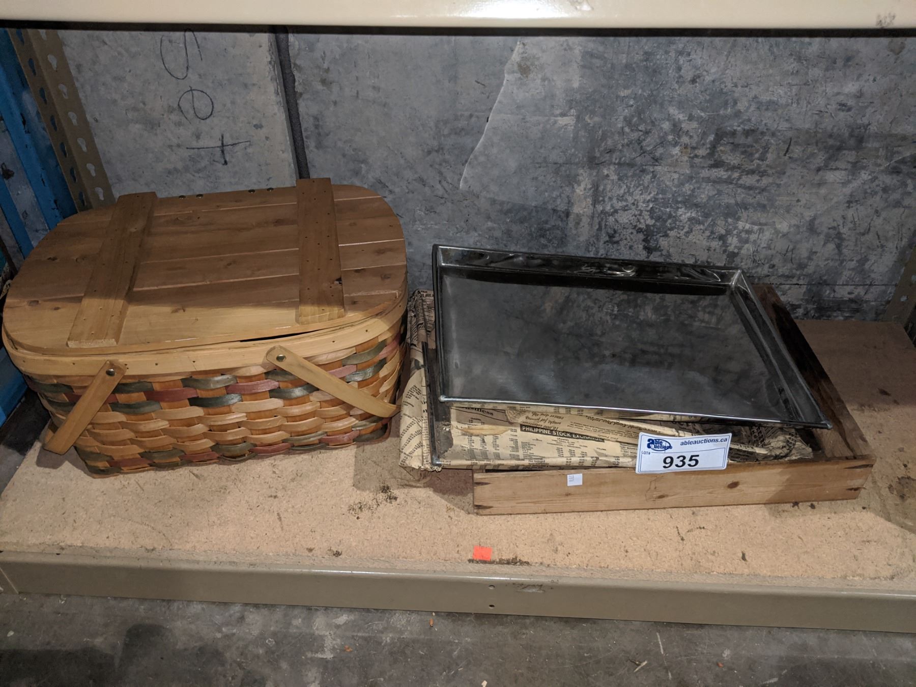 SHELF OF VINTAGE WICKER WOVEN BASKET AND COOKWARE
