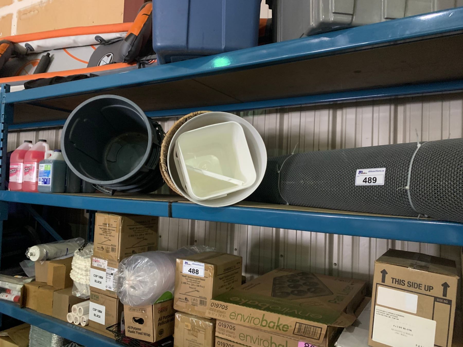 SHELF OF WASTE RECEPTACLES, RUBBER MATTING & CLEANING PRODUCTS