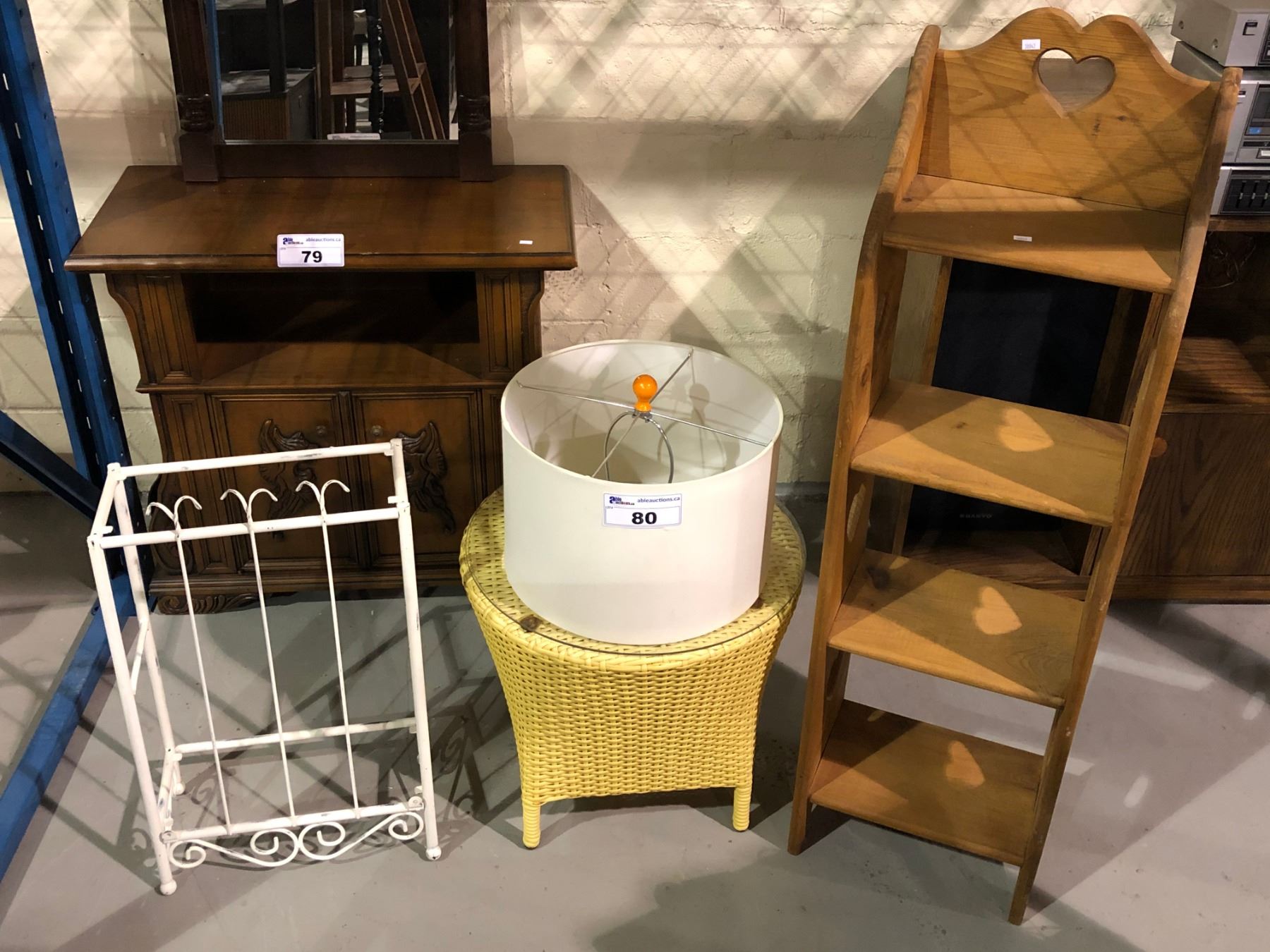 SHELVING UNIT (47 X 14 X 9"), SIDE WICKER TABLE, LAMP SHADE, & STAND