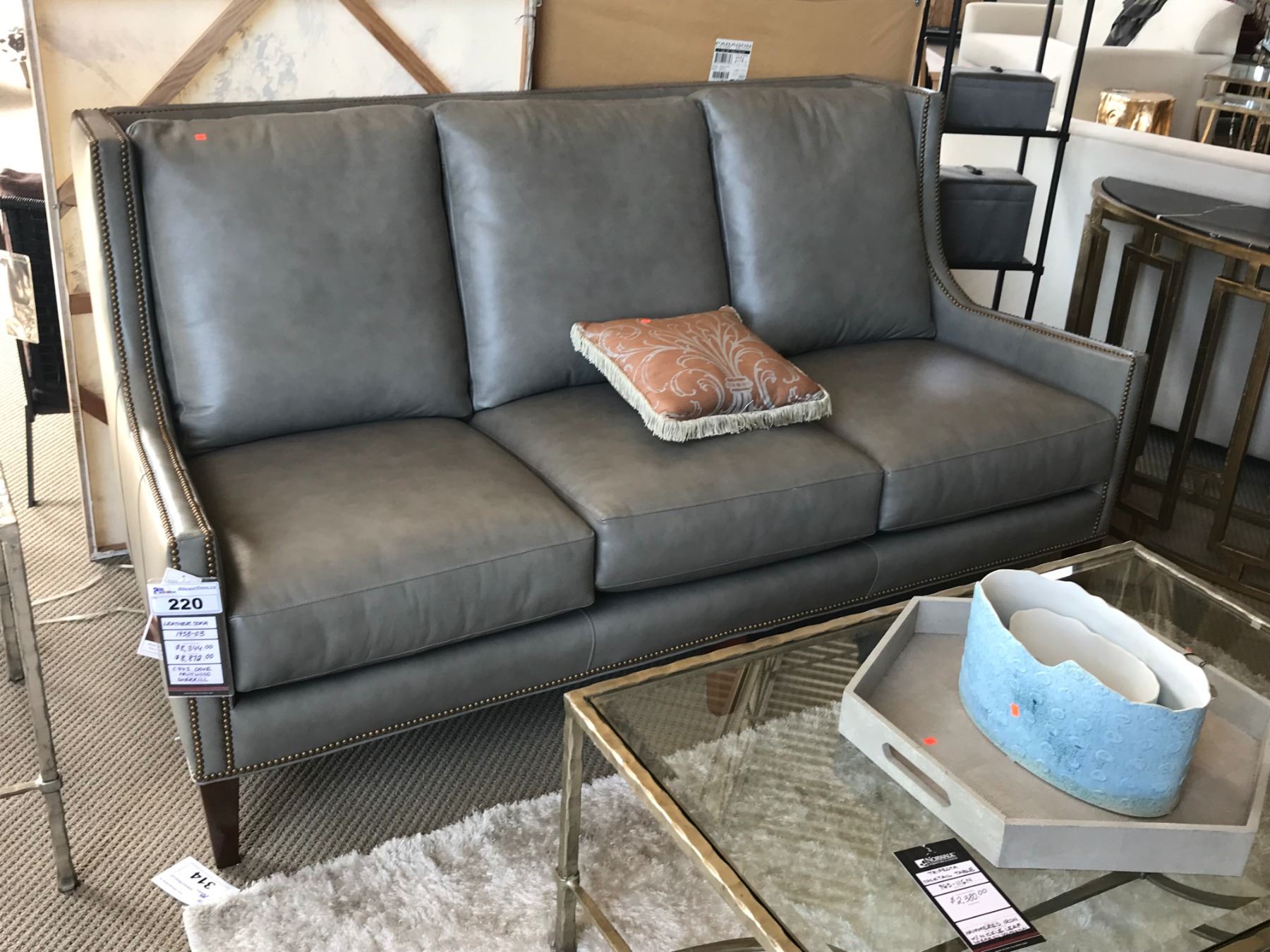 SHERRILL FURNITURE GREY LEATHER STUDDED 3 SEAT SOFA WITH THROW PILLOW