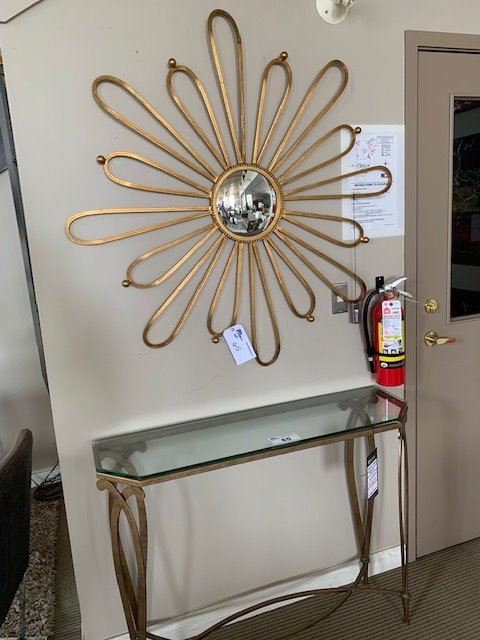 SHERRILL METAL & GLASS FRENCH STYLE CONSOLE TABLE WITH WALL DECOR