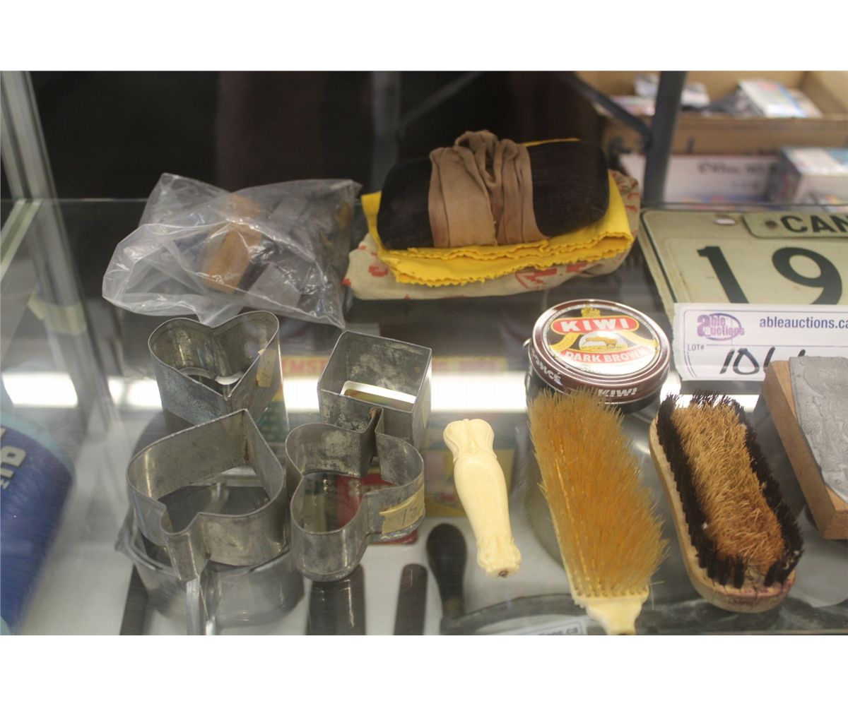 SHOE POLISHING KIT, 9 MOTORCYCLE BLOCK PRINTING STAMPS, ANTIQUE LICENSE PLATE, COOKIE CUTTER AND OTHER COLLECTIBLES