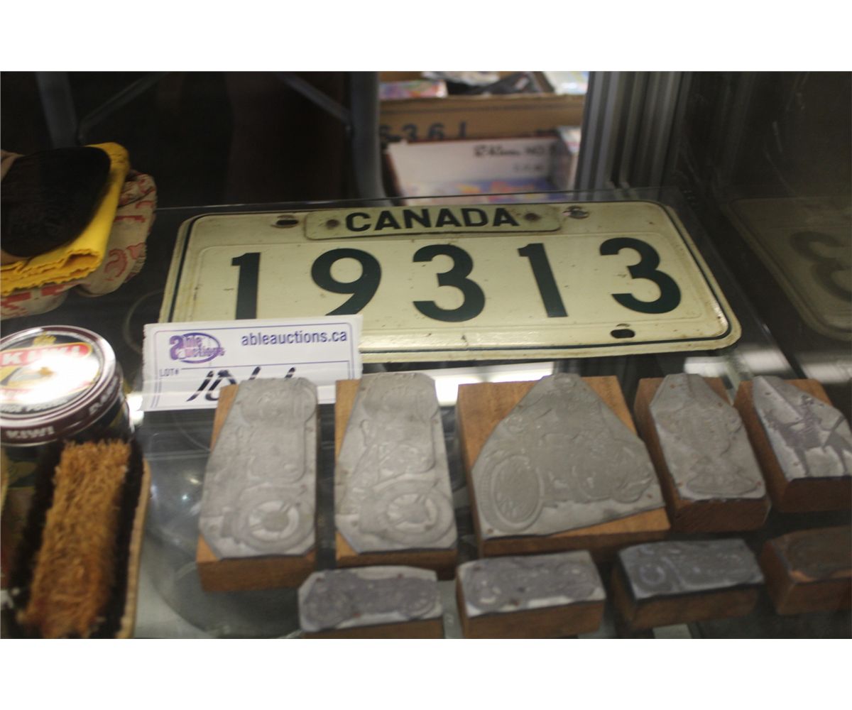 SHOE POLISHING KIT, 9 MOTORCYCLE BLOCK PRINTING STAMPS, ANTIQUE LICENSE PLATE,