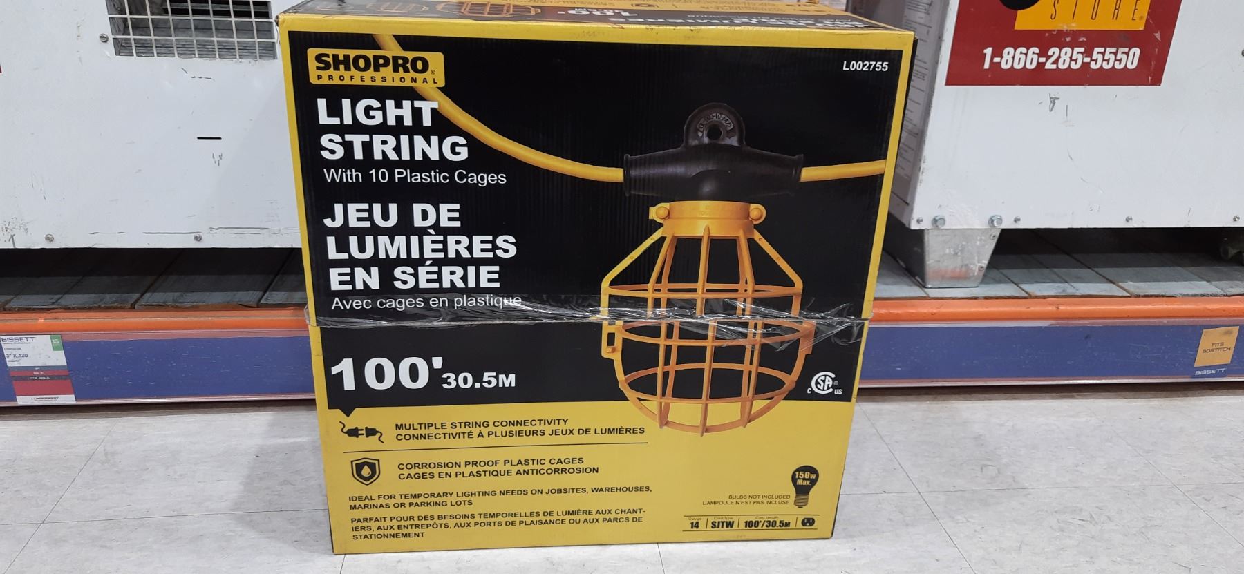 SHOPRO 100' INDUSTRIAL ELECTRIC JOB SITE LIGHT STRING WITH 10 PLASTIC CAGES