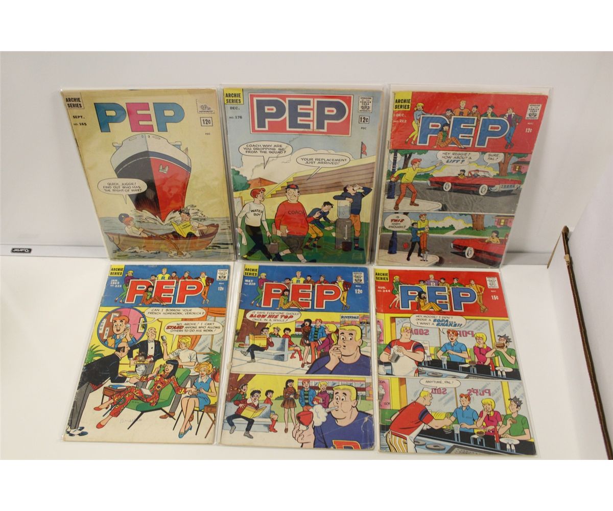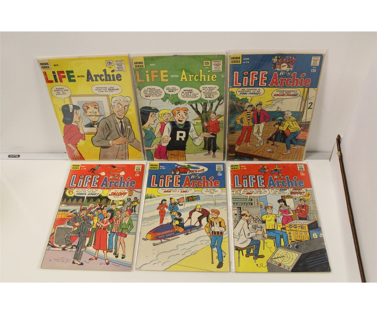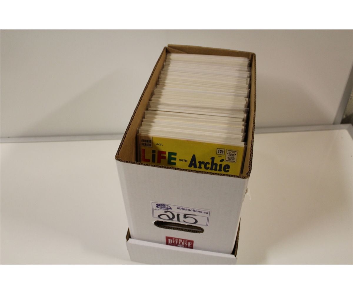 SHORT BOX OF ASSORTED ARCHIE TITLES INCLUDING: LIFE WITH ARCHIE, PEP, LAUGH, REGGIE AND ME AND MORE. PLENTY OF 10 AND 12 CENT COVERS, LOW-MID GRADE AVERAGE. NICE BOX!